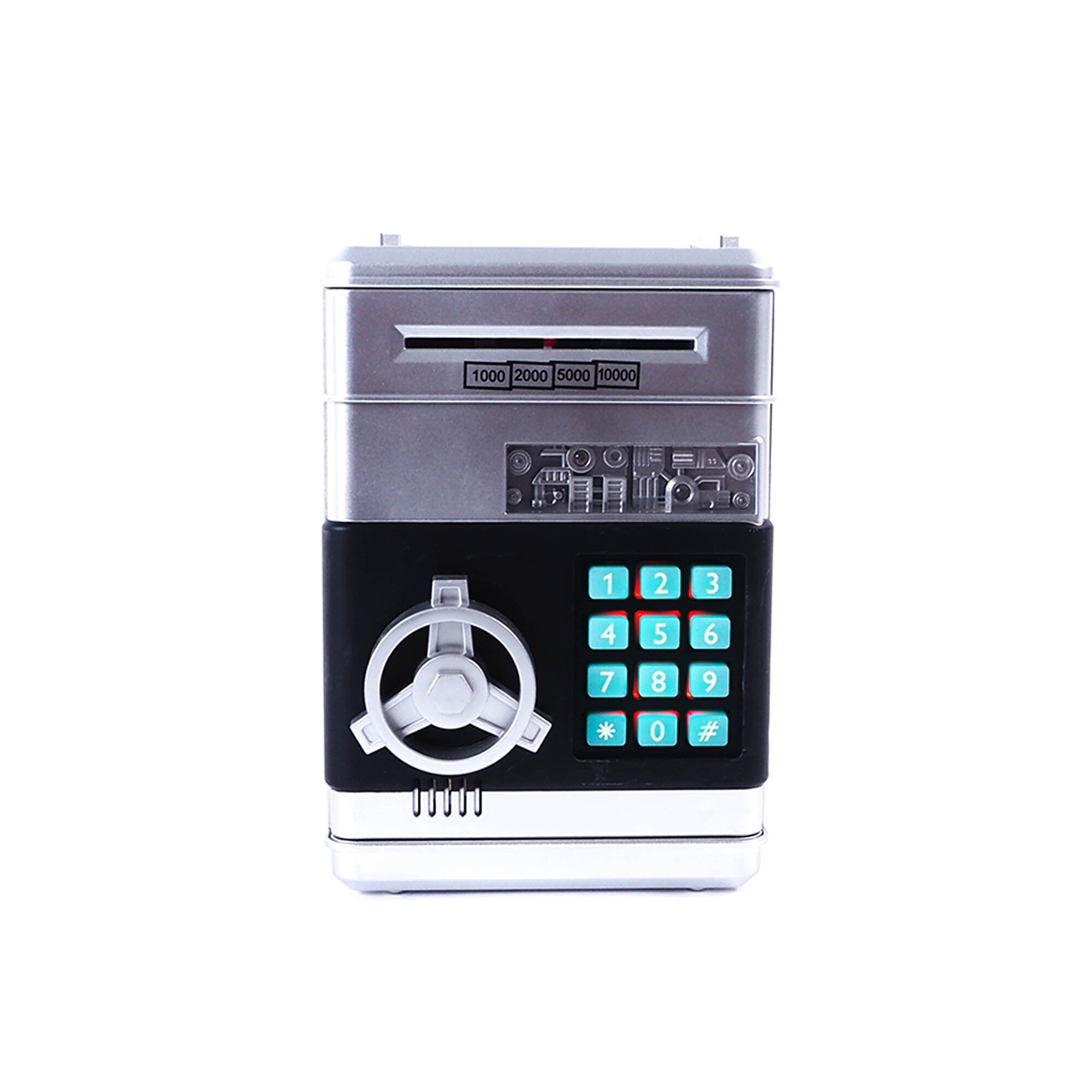Касичката сейф е проектирана да бъде възможно най-удобна за потребителя. Монетите се пускат в горната част, а хартиените банкноти в предната част. А ако искате да промените паролата, просто отворете касичката с помощта на предварително зададения код 0000, задръжте бутона * и въведете новата четирицифрена парола. Потвърдете го с бутона # и сте готови.