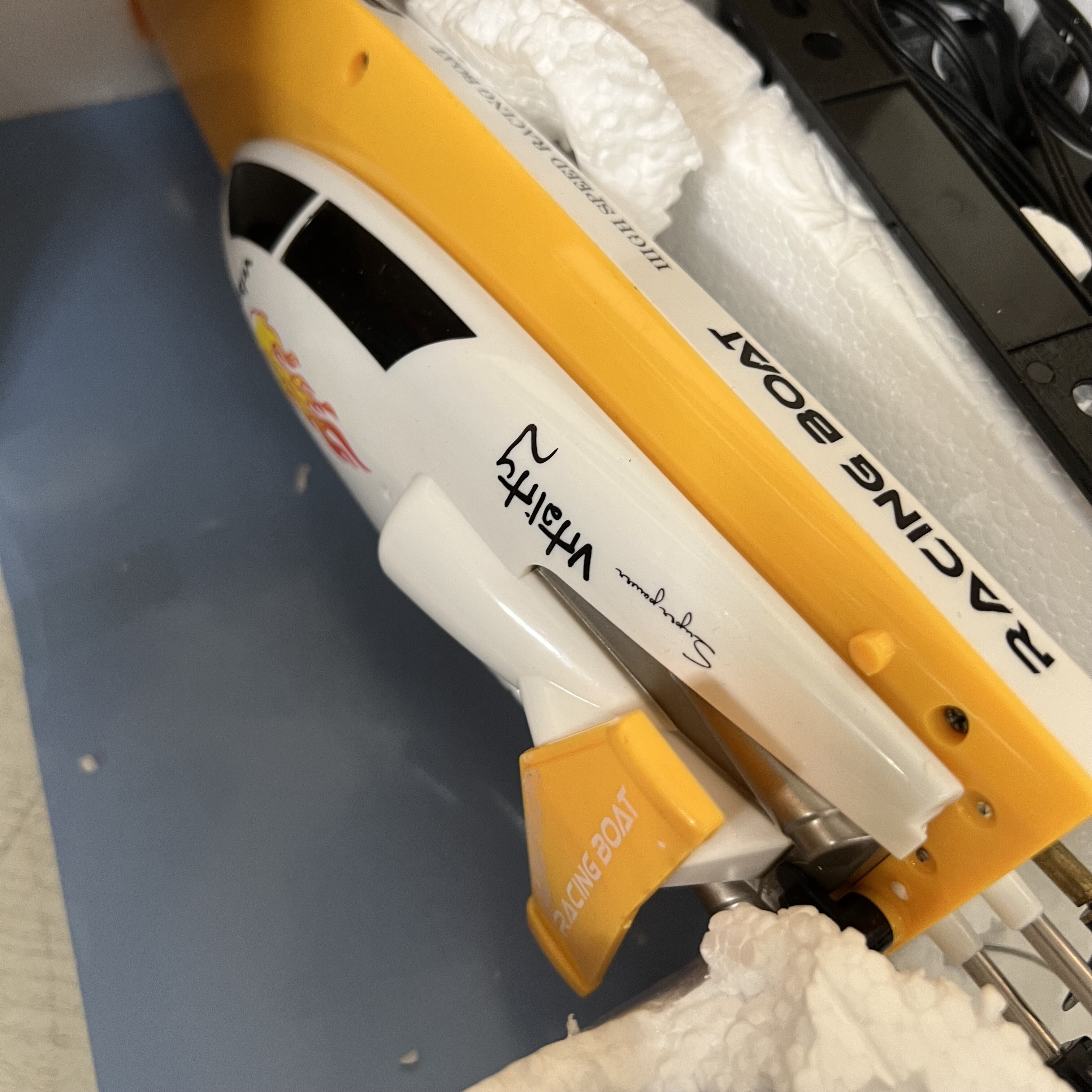Моторната лодка е изработена от устойчиви материали с метални елементи в скоростната кутия. Лодката се управлява от двуканален, напълно пропорционален предавател на честота 2,4Ghz, така че няма да има проблем да се организират състезания! Със силен двигател лодката изминава до 5,5 м в секунда. Освен това радиото има акселерационен и въртящ тример, което е необичайно за този клас.