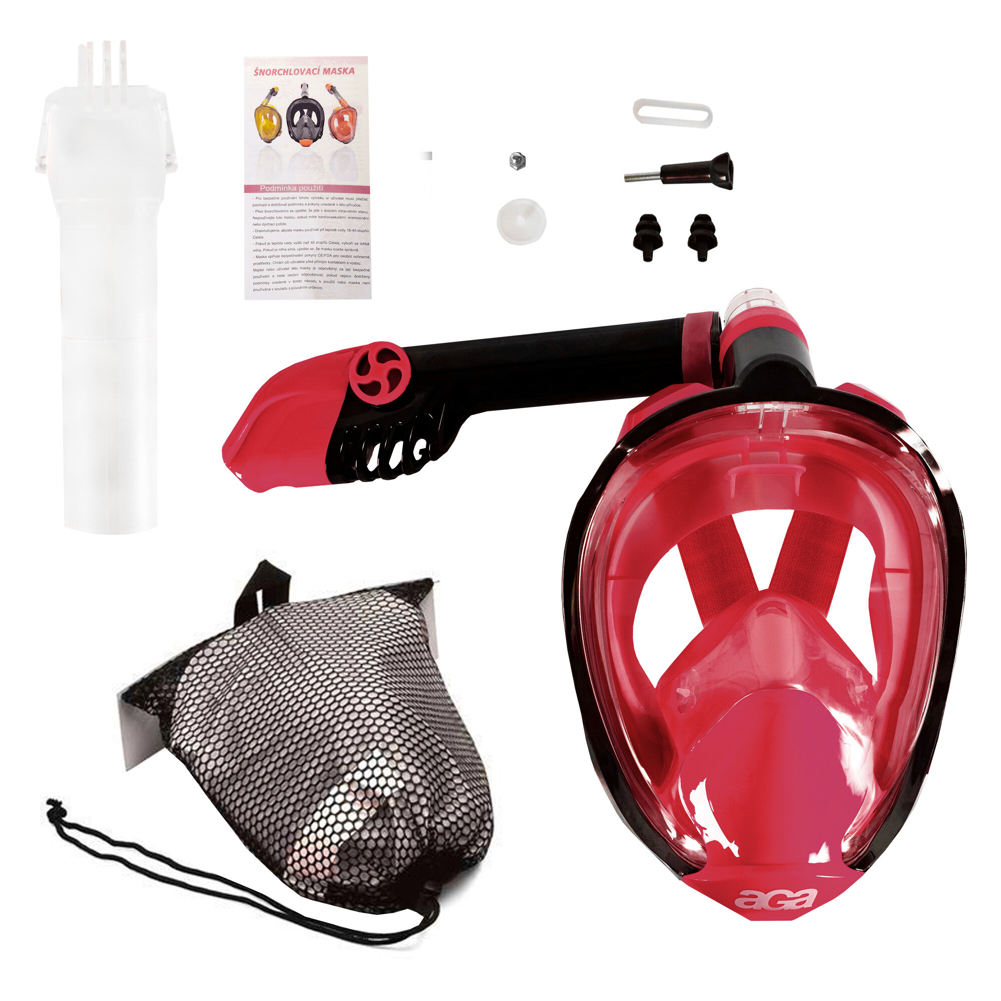 Гмуркащата маска Aga е изработена от поликарбонат и предлага огромна защита срещу проникване на вода, както и комфортно носене. Осигурява 180° зрително поле с циркулационна дихателна система. Вдишвате свеж въздух както през носа, така и през устата, след което той излиза през еднопосочни отвори в маската.