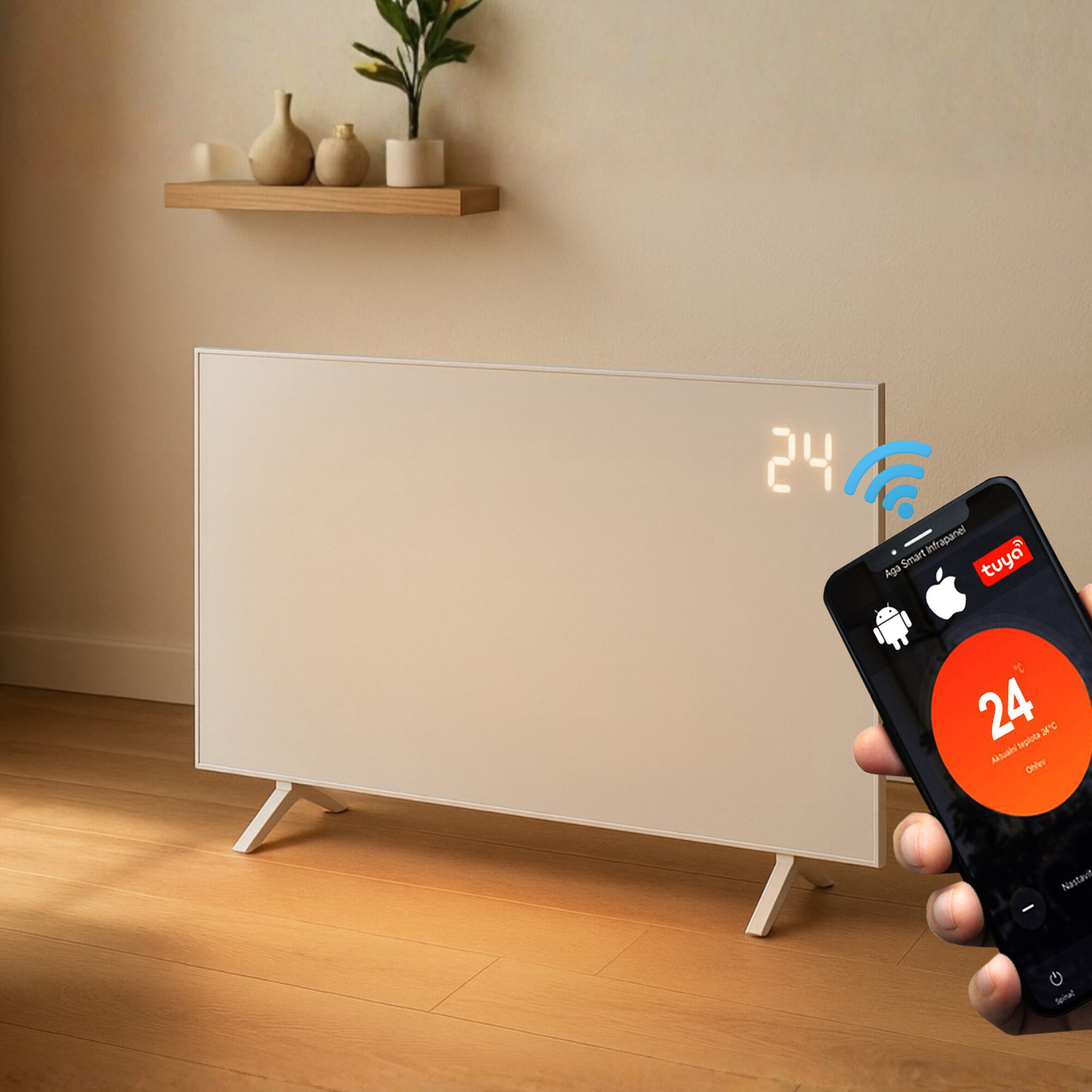Панелът може да се управлява и с помощта на дистанционно управление или благодарение на интегрирания Wi-Fi, отоплителният панел може да се свърже с интернет и след това да се управлява от всяко място чрез приложението Tuya.