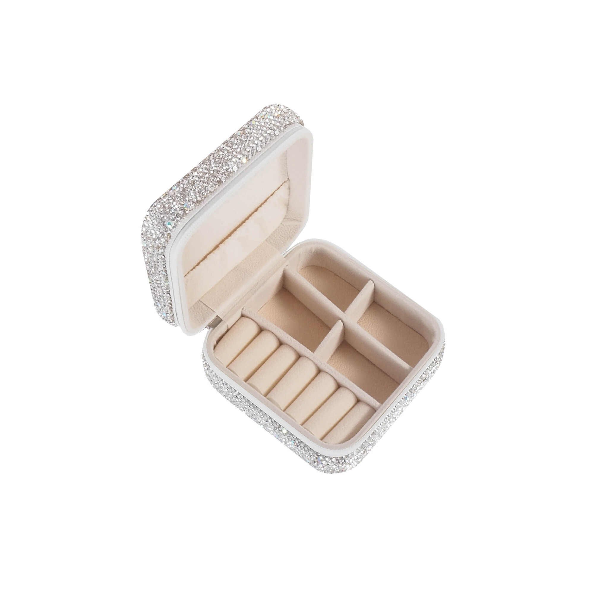 Кутията за бижута е украсена с камъчета, които ѝ придават усещане за лукс и елегантност. Всеки детайл е внимателно обработен, за да изглежда кутията за бижута като истинско съкровище. Благодарение на универсалния си дизайн, тя се вписва във всяка среда, независимо дали я поставите на тоалетката, в спалнята или в банята.