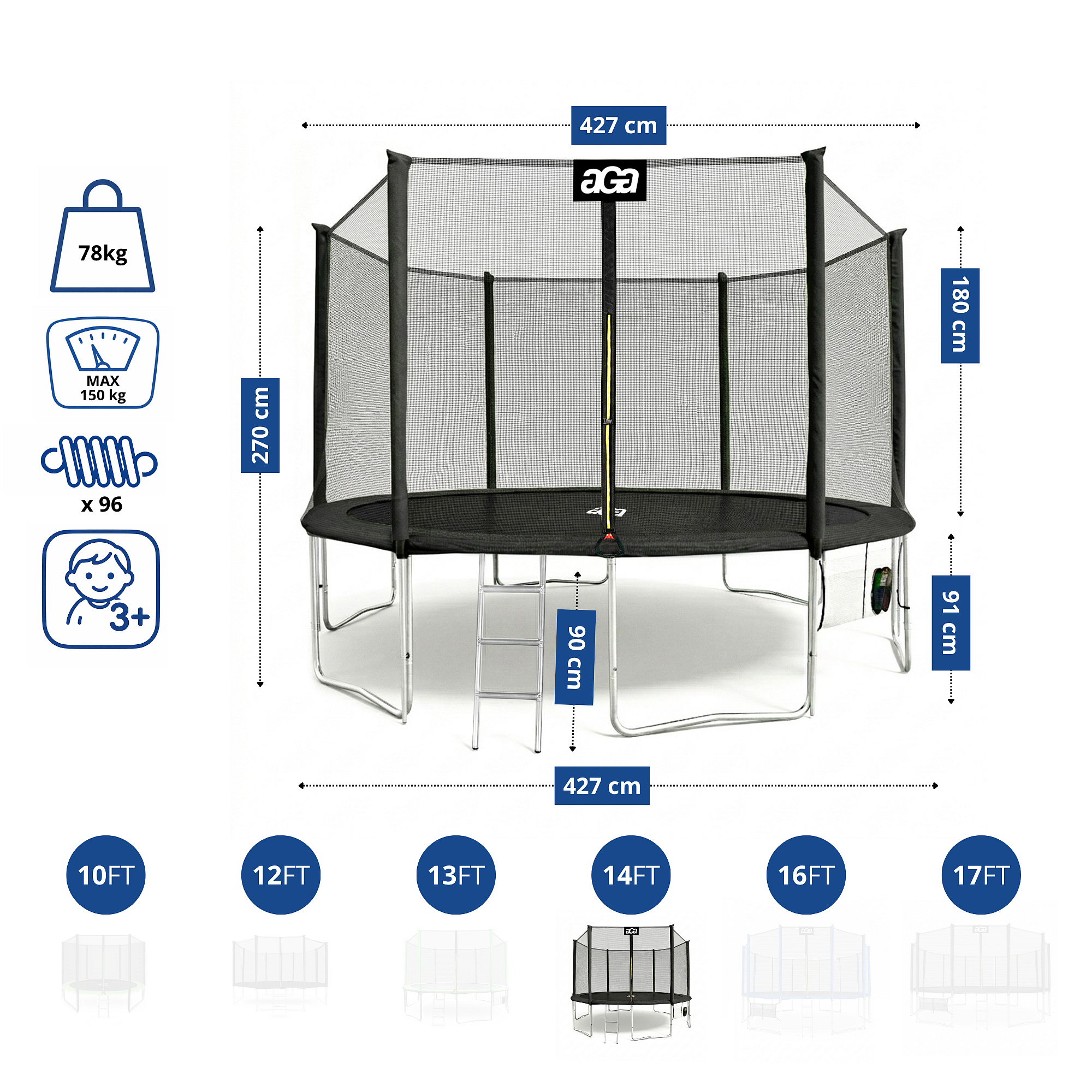 Спецификация на батут Aga SPORT PRO 430 см с предпазна мрежа.