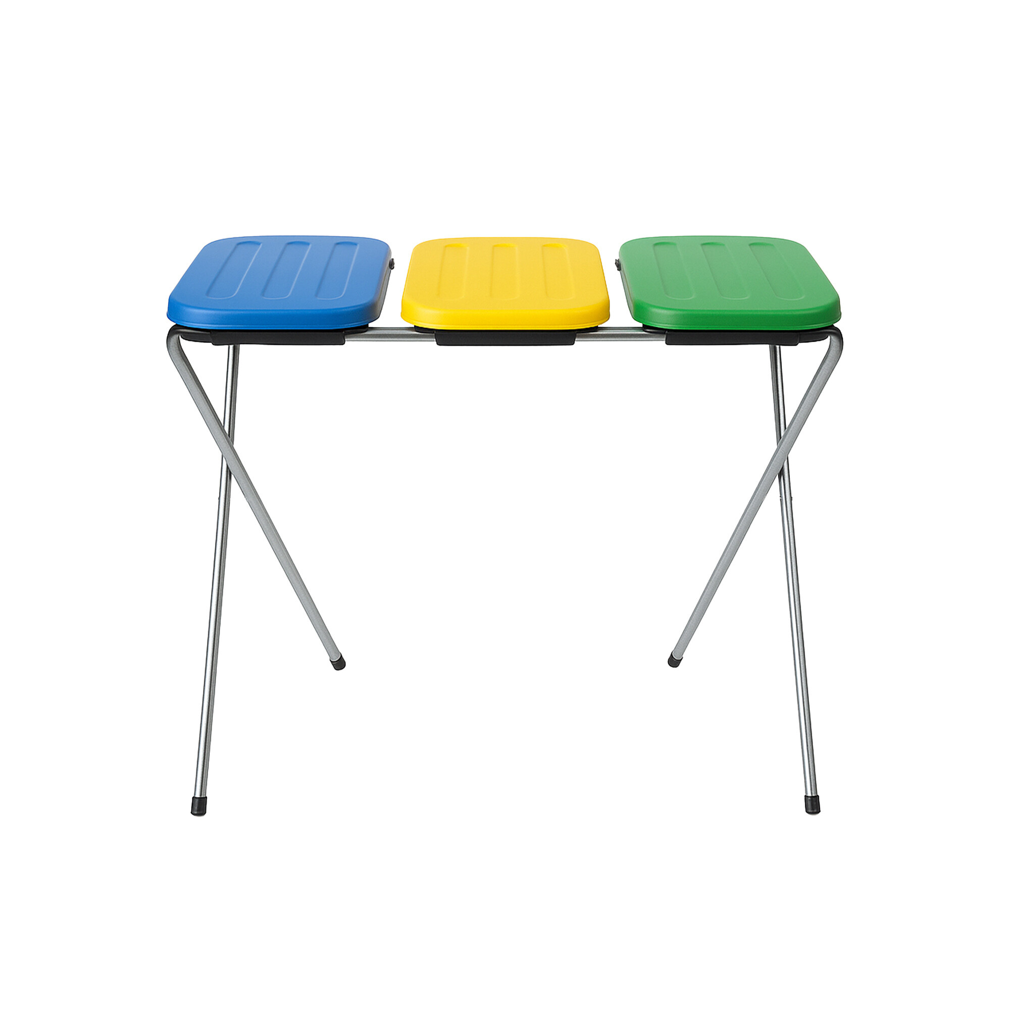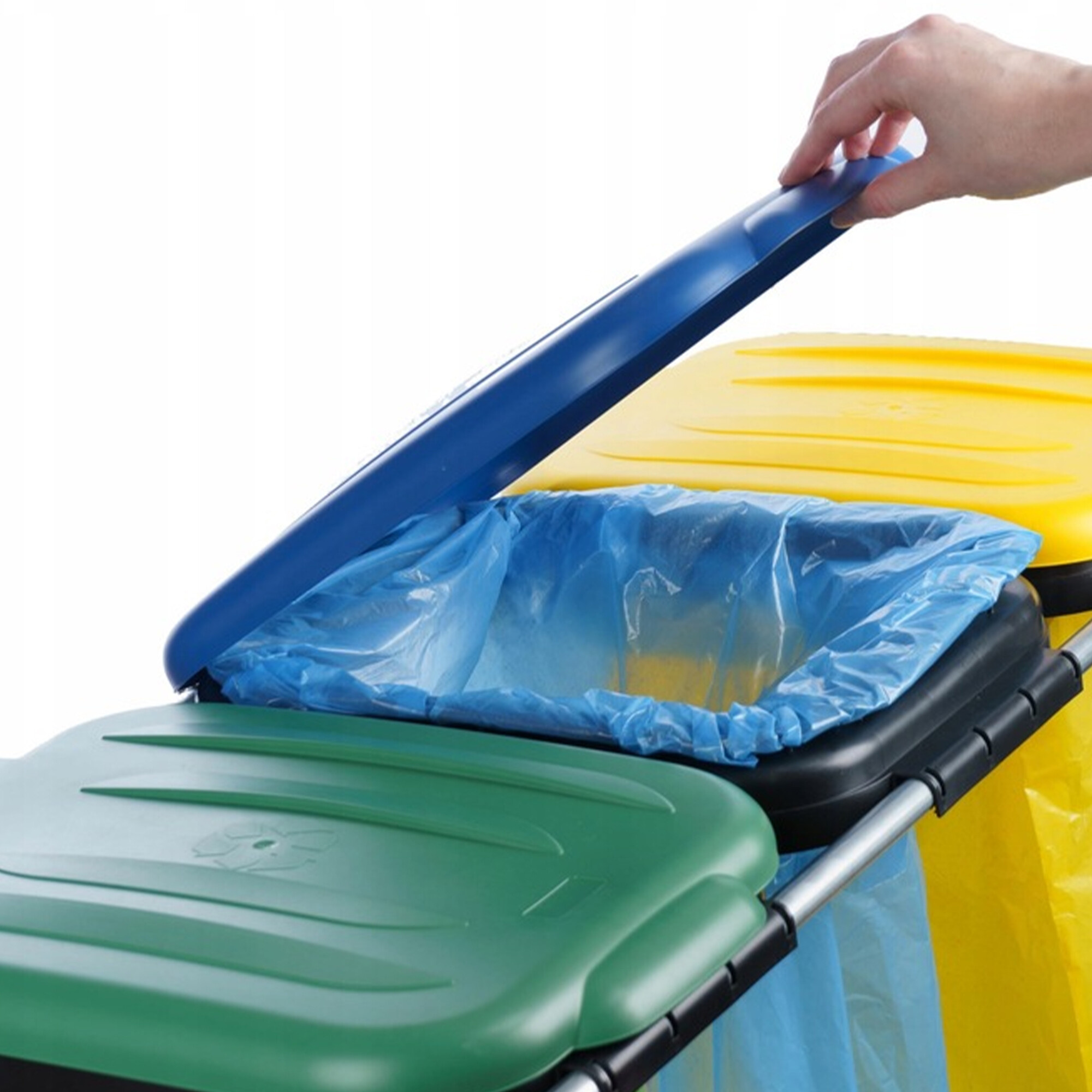 Сгъваемата стойка за торби за боклук е практично решение за всеки, който се нуждае от прегледно и ефективно сортиране на отпадъците. Капаците в цветове жълто, зелено и синьо отговарят на европейските стандарти за разделно събиране на отпадъци и позволяват бързо разпознаване на правилния контейнер.