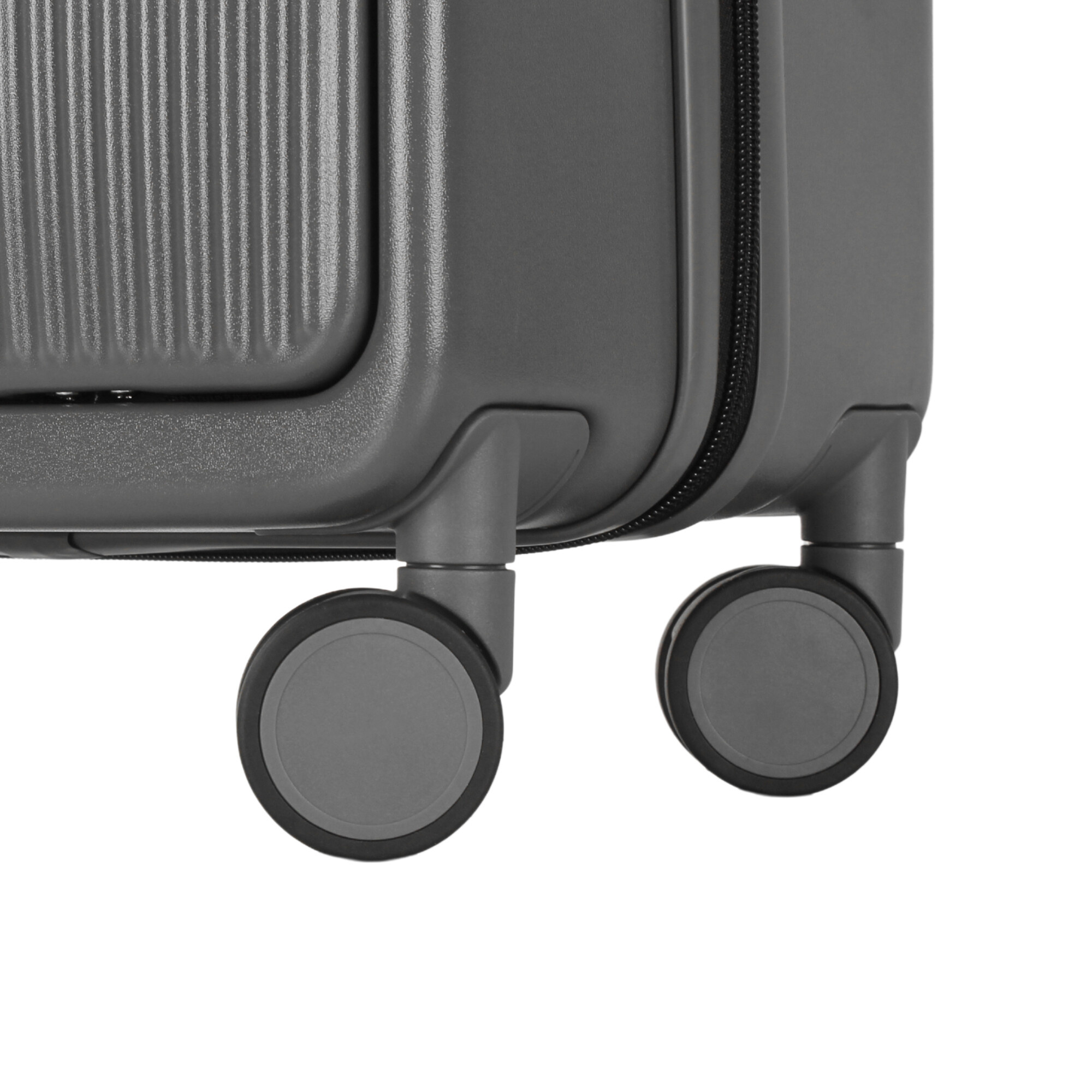 Четири 360° въртящи се двойни колела осигуряват гладко и тихо движение върху всички видове повърхности. Лесното управление се осигурява от телескопична тройно регулируема дръжка и две здрави дръжки от горната и страничната част на куфара.