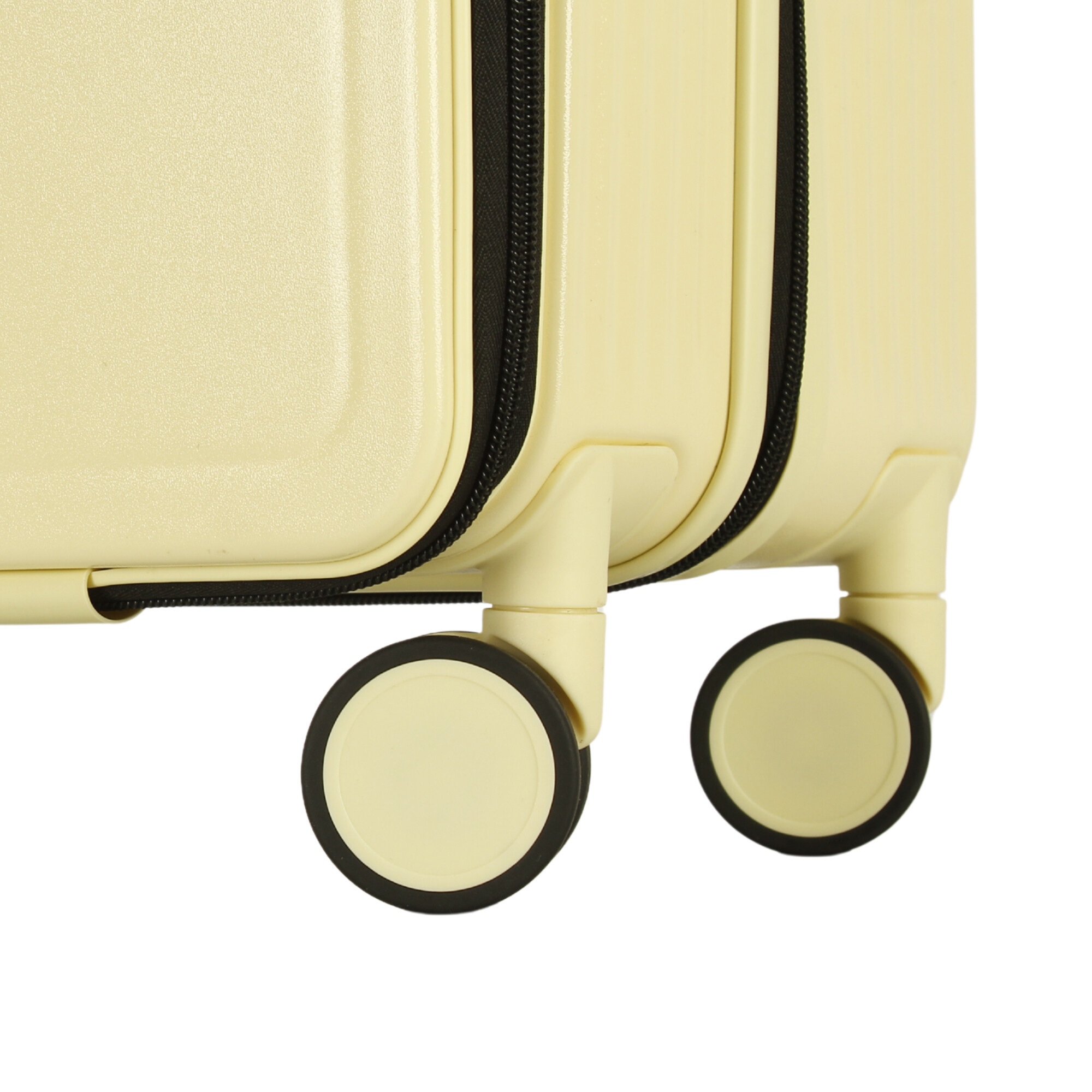 Четири 360° въртящи се двойни колела осигуряват гладко и тихо движение върху всички видове повърхности. Лесното управление се осигурява от телескопична тройно регулируема дръжка и две здрави дръжки от горната и страничната част на куфара.