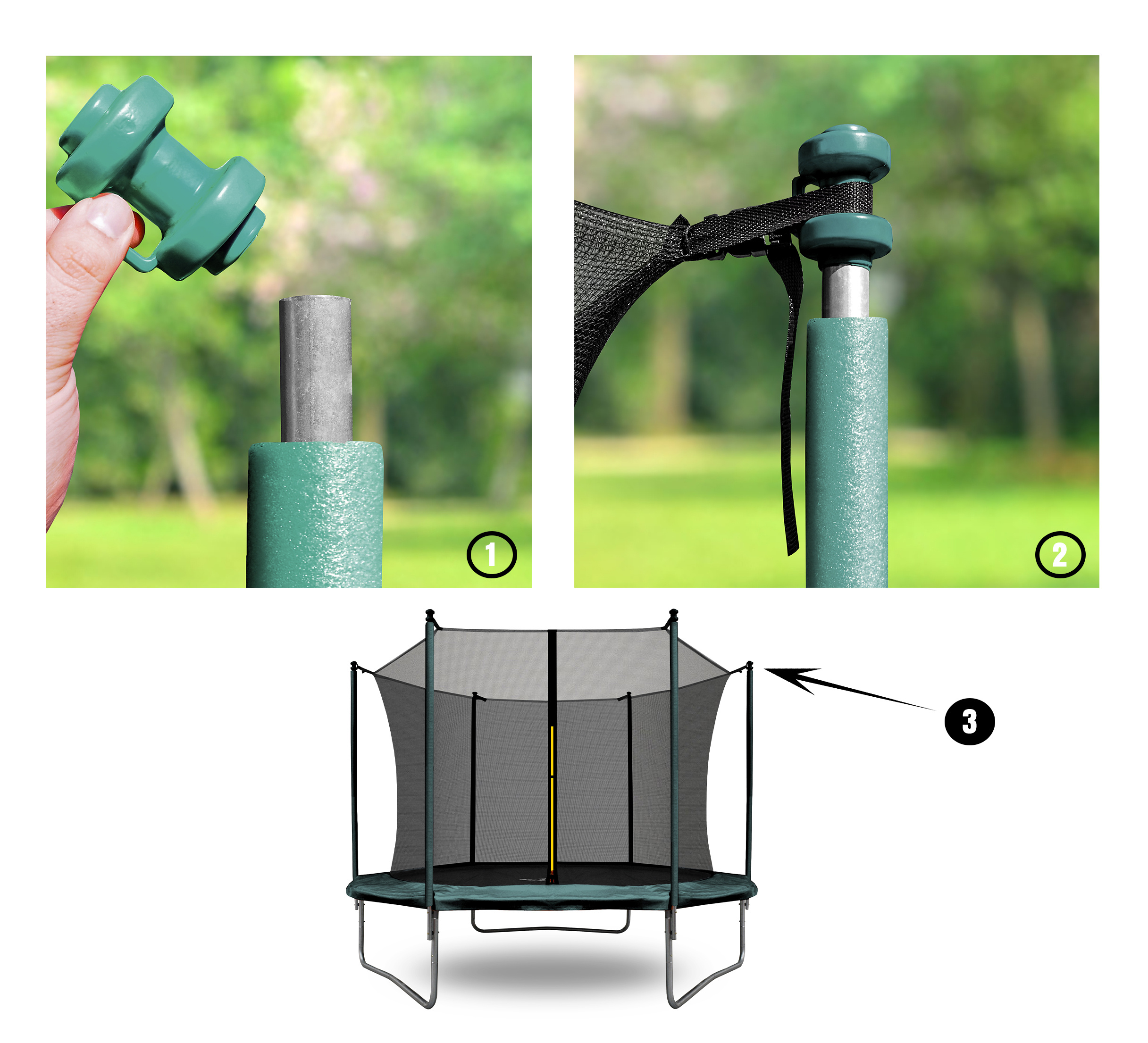 Шапката се поставя на горната защитна греда на мрежата на батута и основната ѝ цел е да предотврати нараняване от остри ръбове.