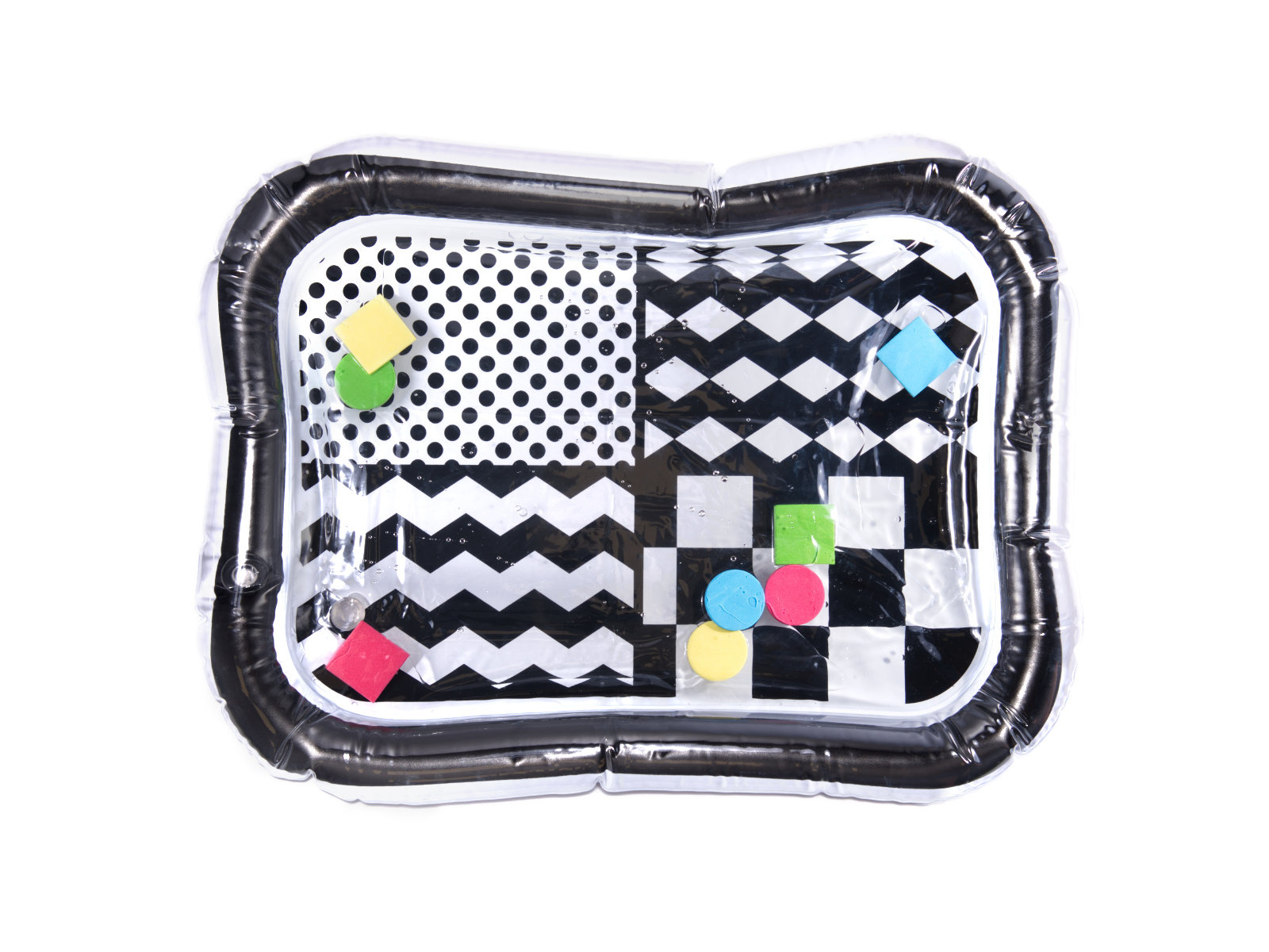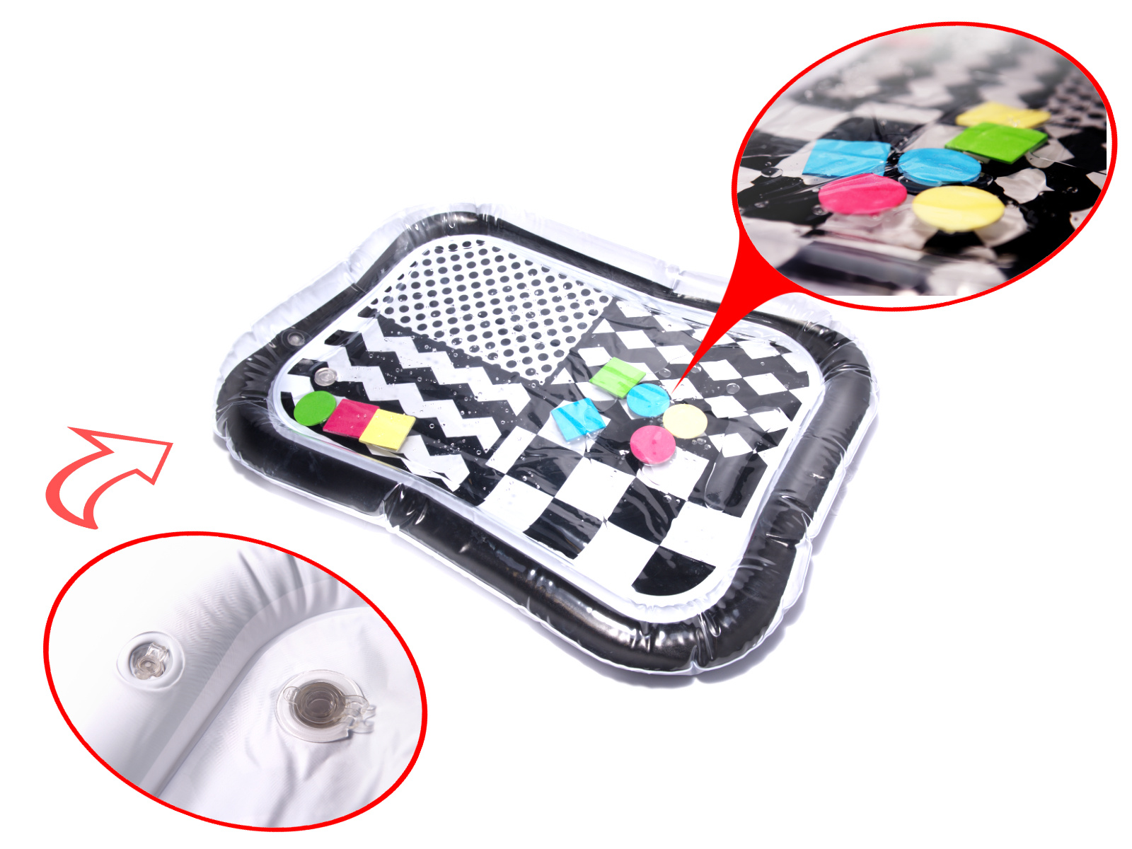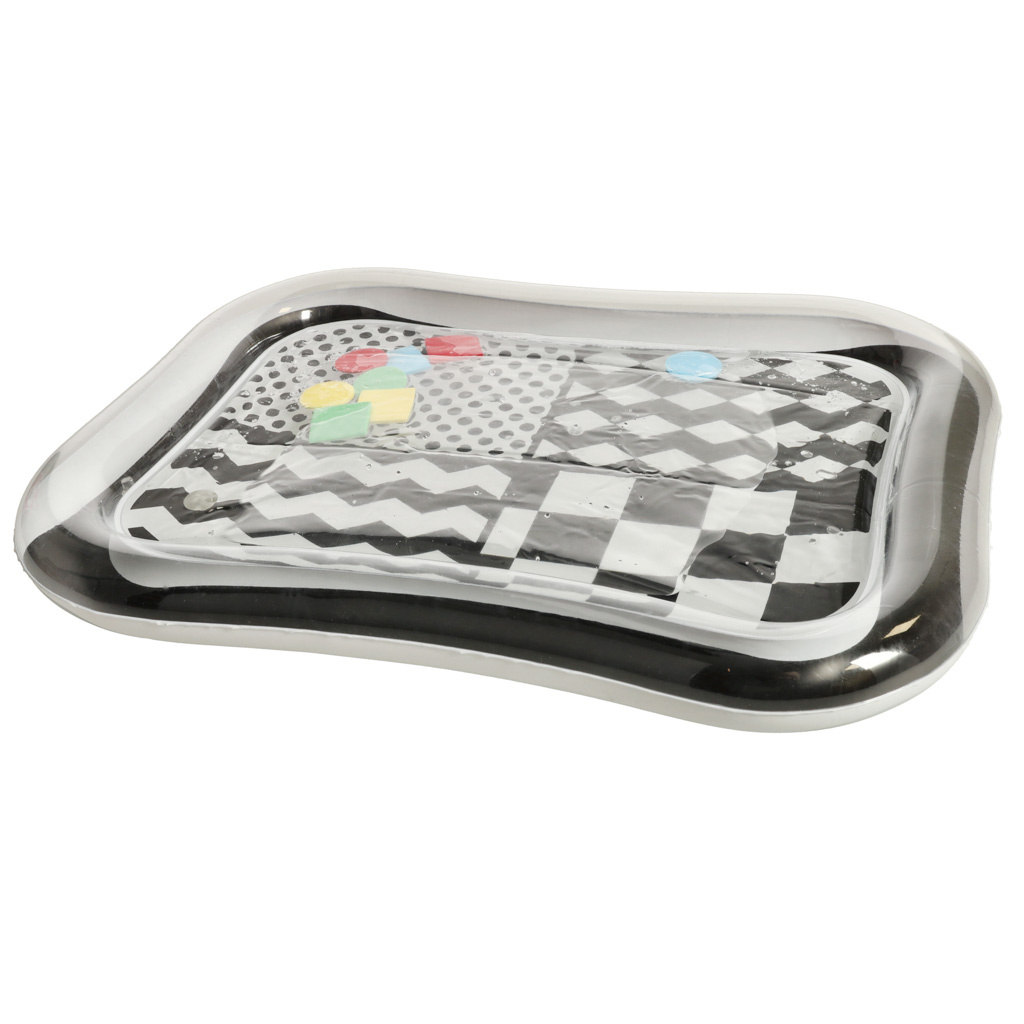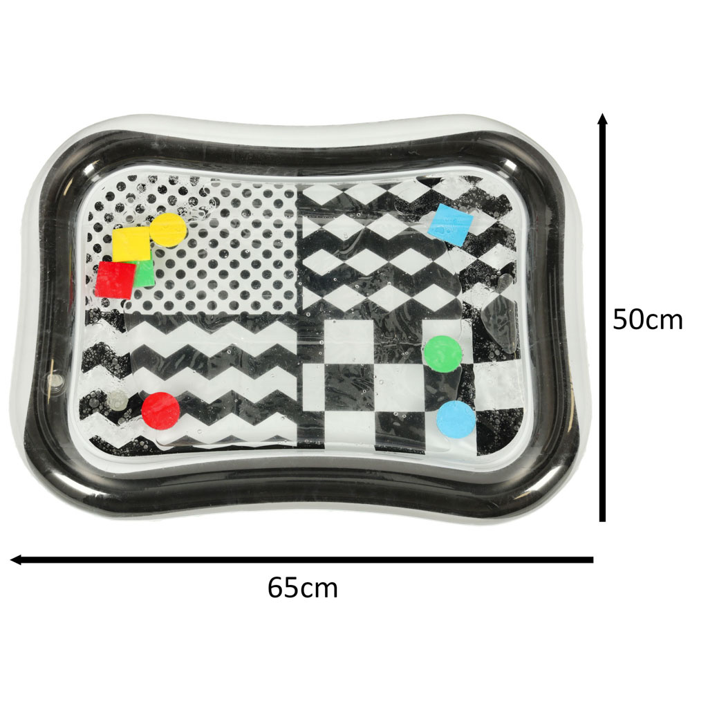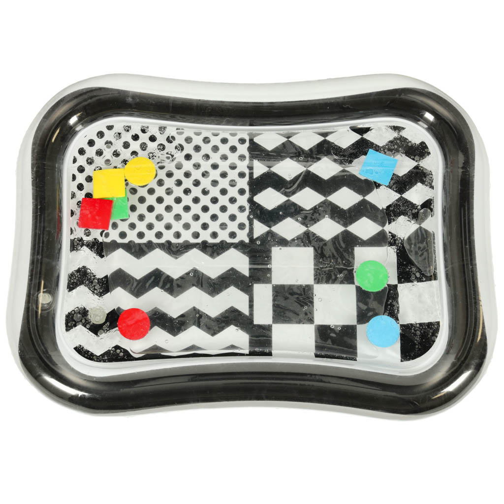 Невероятна сензорна подложка за деца с контрастен черно-бял модел. Във вътрешността на килимчето са разположени цветни геометрични фигури, които се движат, когато детето се движи. Плаващите елементи завладяват детето и привличат вниманието му. Краят на подложката трябва да се надуе с въздух, а центърът да се напълни с вода. За по-добри резултати центърът може да се напълни отчасти с вода и отчасти с въздух.