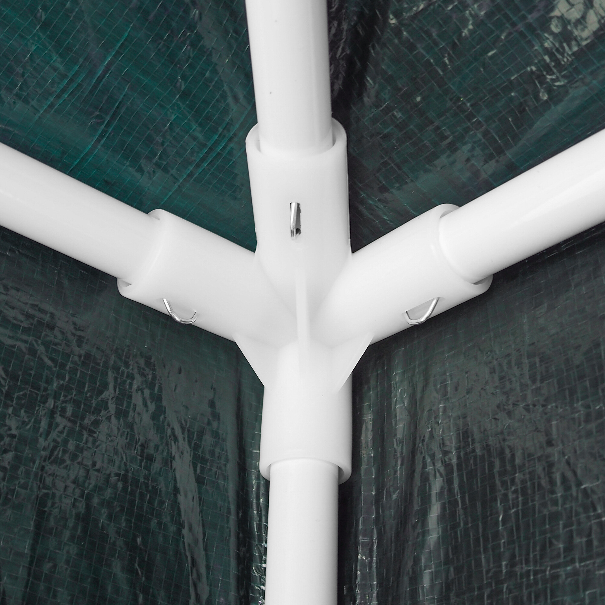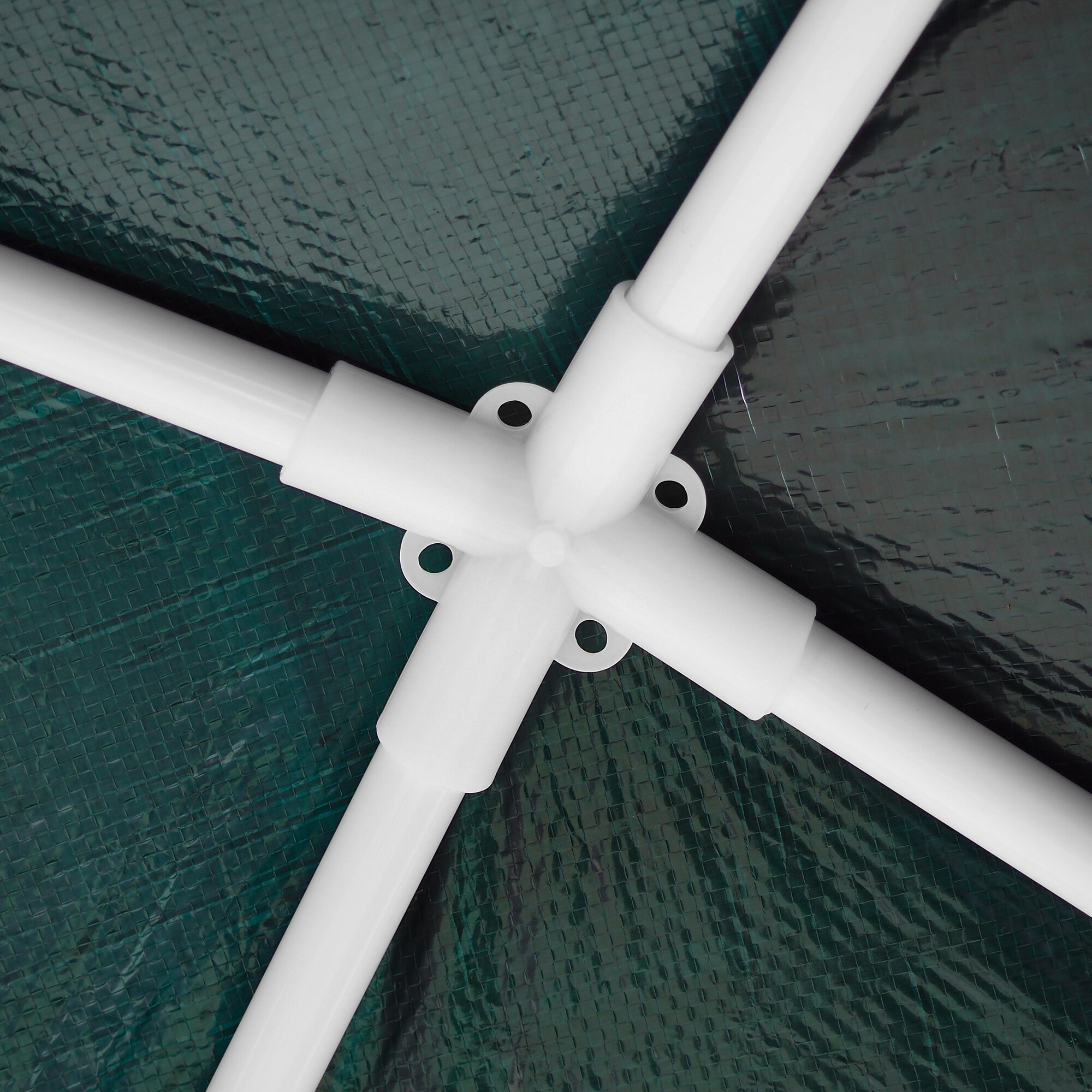 Покритието на беседката е изработено от здрав полиетилен с грамаж 100g/m2, който е устойчив на разкъсване и UV лъчение. Този материал осигурява дълъг живот и лесна поддръжка. Просто го избършете с влажна кърпа и беседката отново ще бъде като нова.