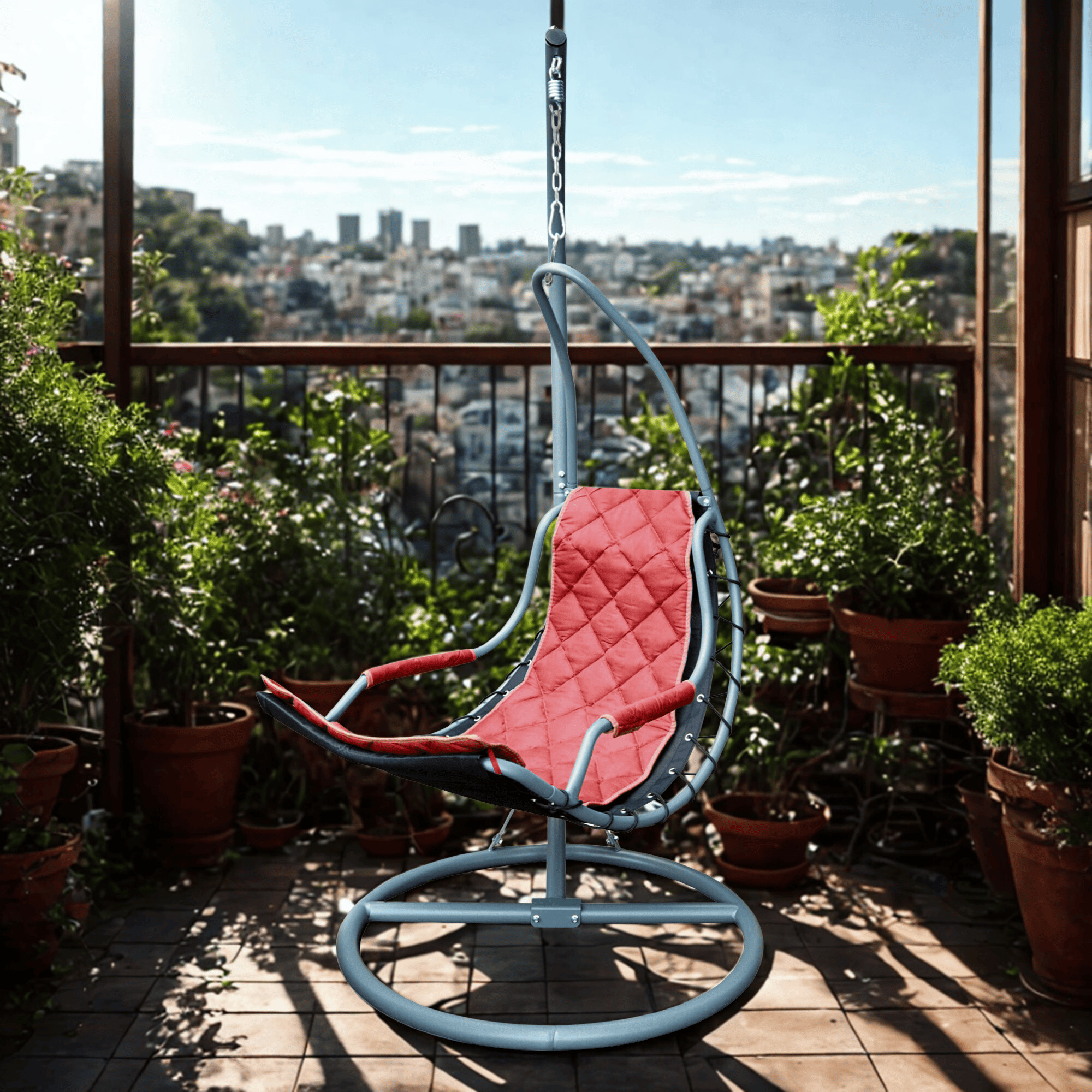Висящият стол е проектиран с оглед на съвременната естетика и максимален комфорт. Неговият червен цвят лесно се вписва във всеки интериор или екстериор, независимо дали го поставите на терасата, балкона, в хола или в градината.