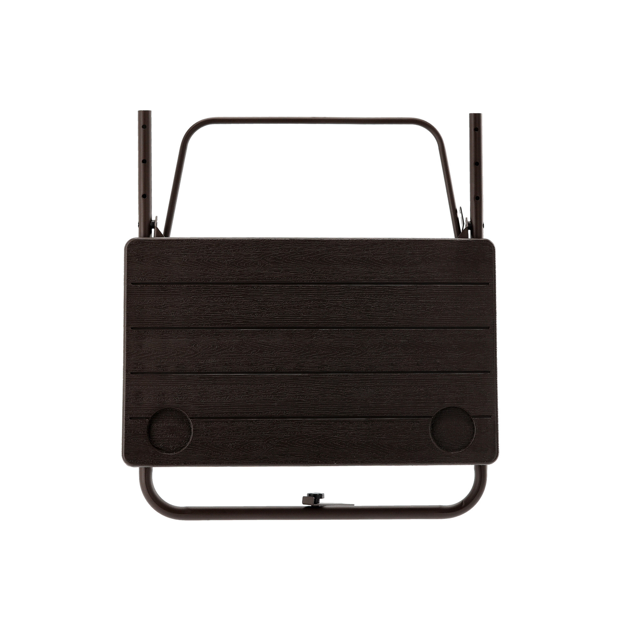 Самата повърхност на масата, с регулируема височина 73/78,5 или 83,5 см, е оборудвана с два държача за напитки.Предимството на тази масичка е нейната изключителна компактност и лесна сглобяемост.