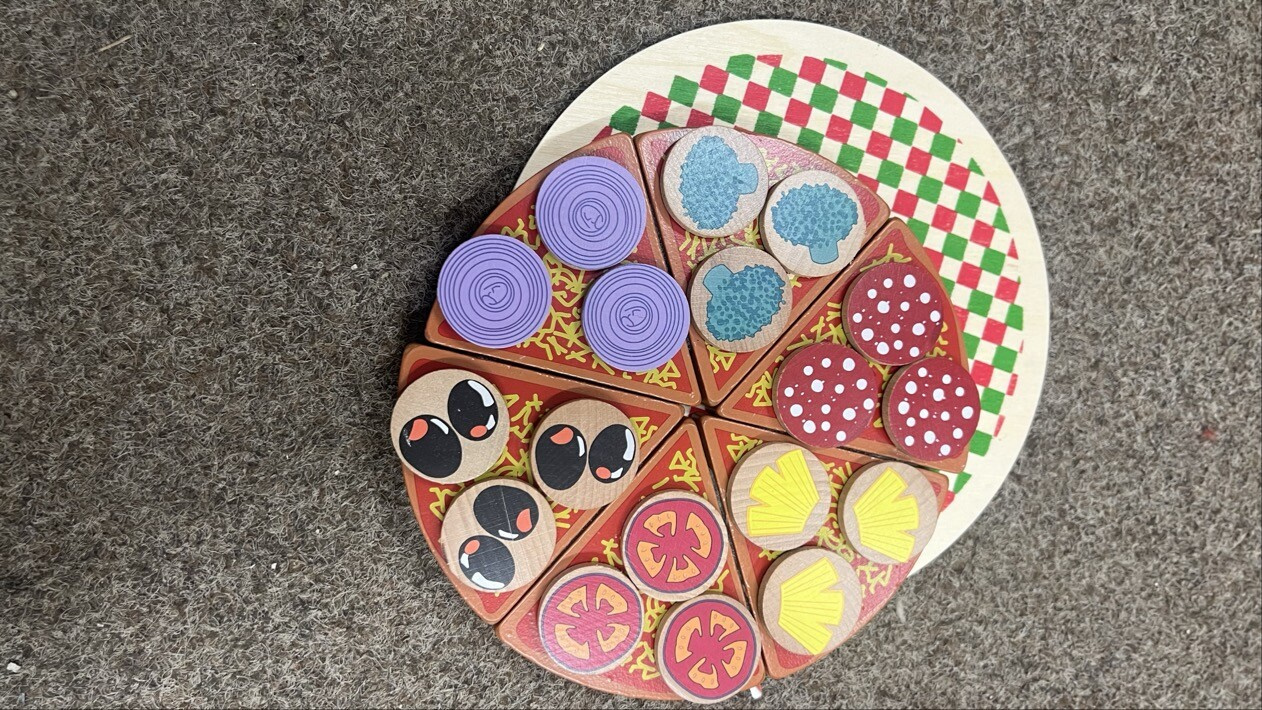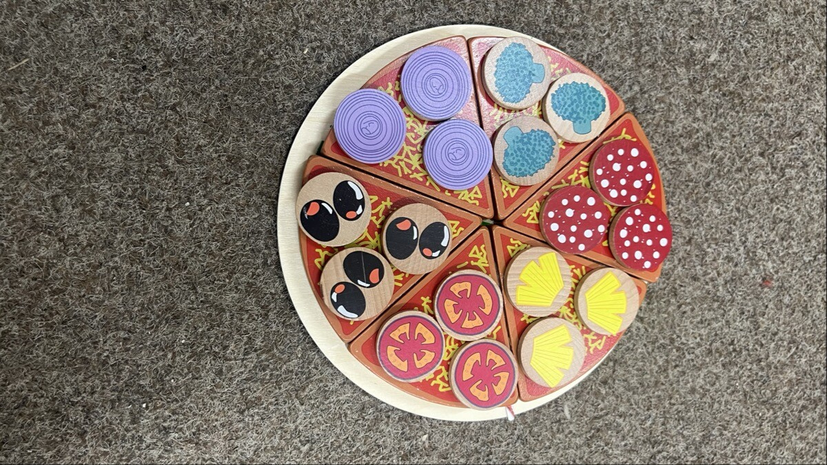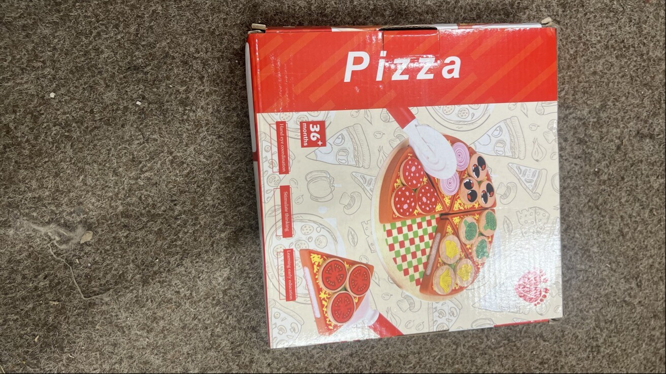 - Комплектът съдържа дървен кръгъл нож, лопатка за вземане на парче пица, дървена дъска и пица с ингредиенти