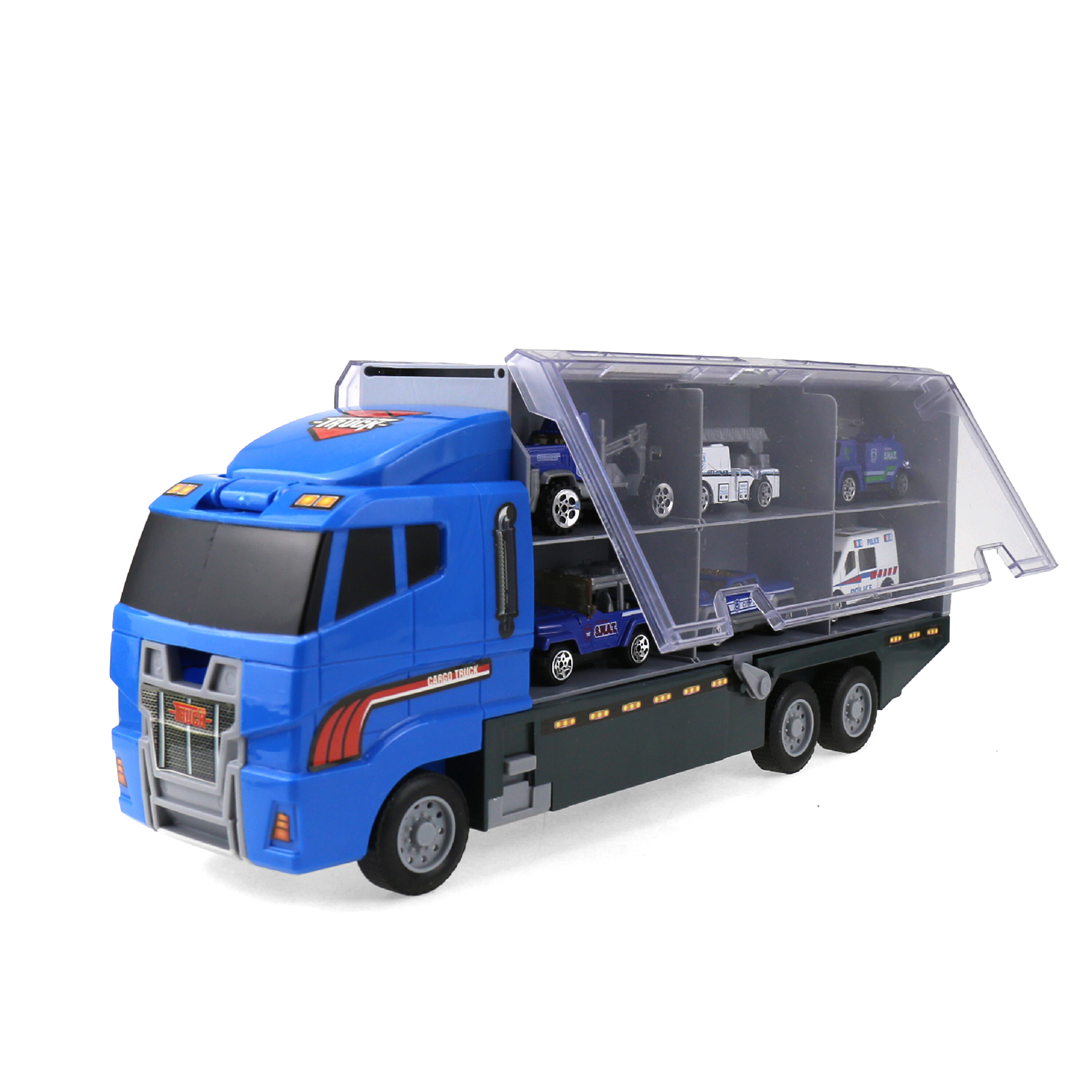 Този камион се отваря от двете страни и е оборудван с 6 полицейски коли.