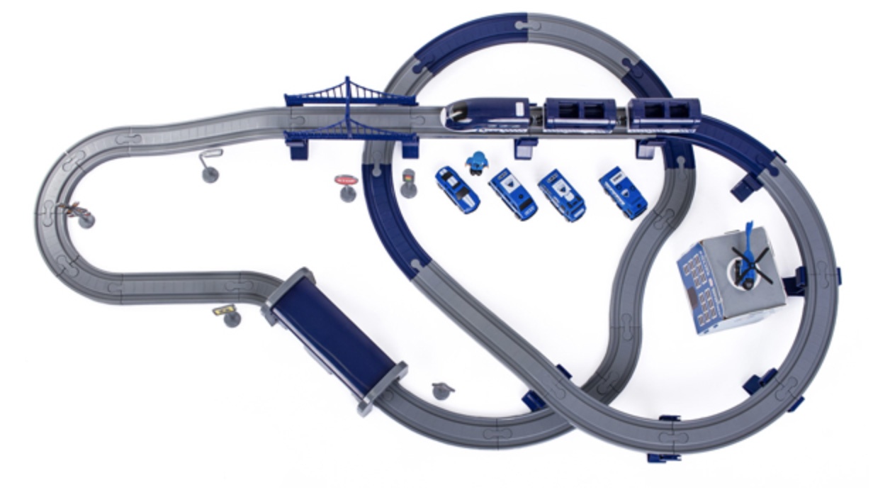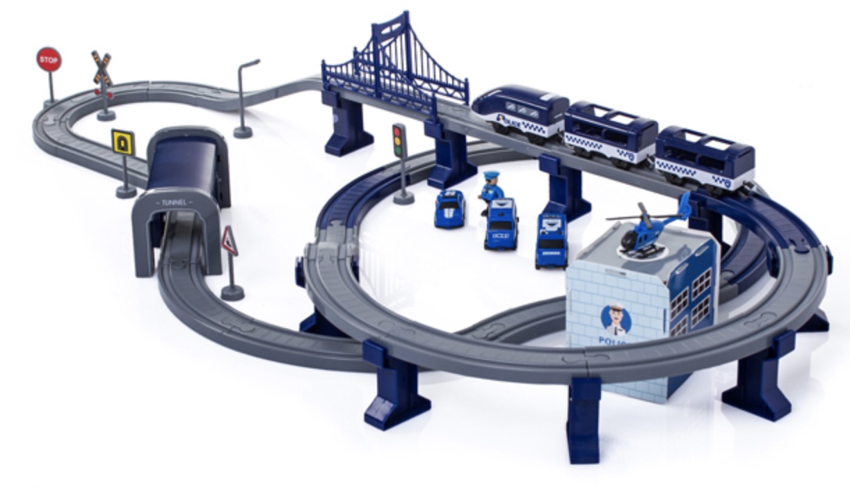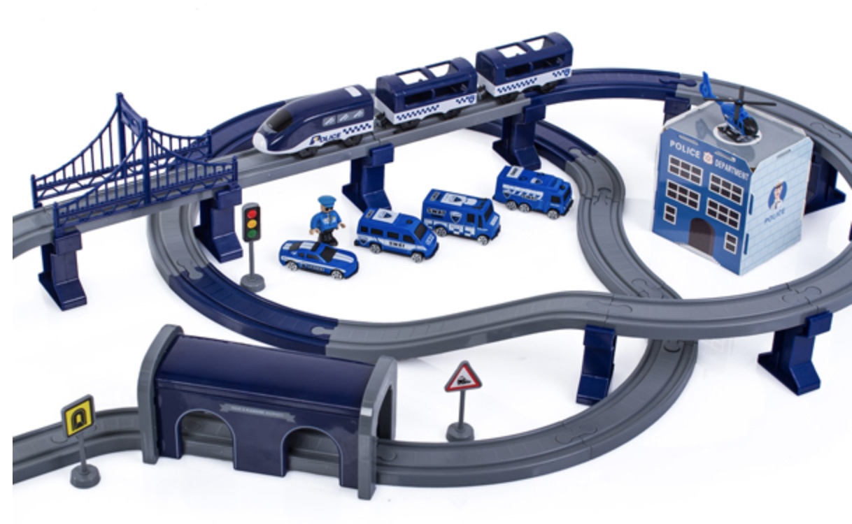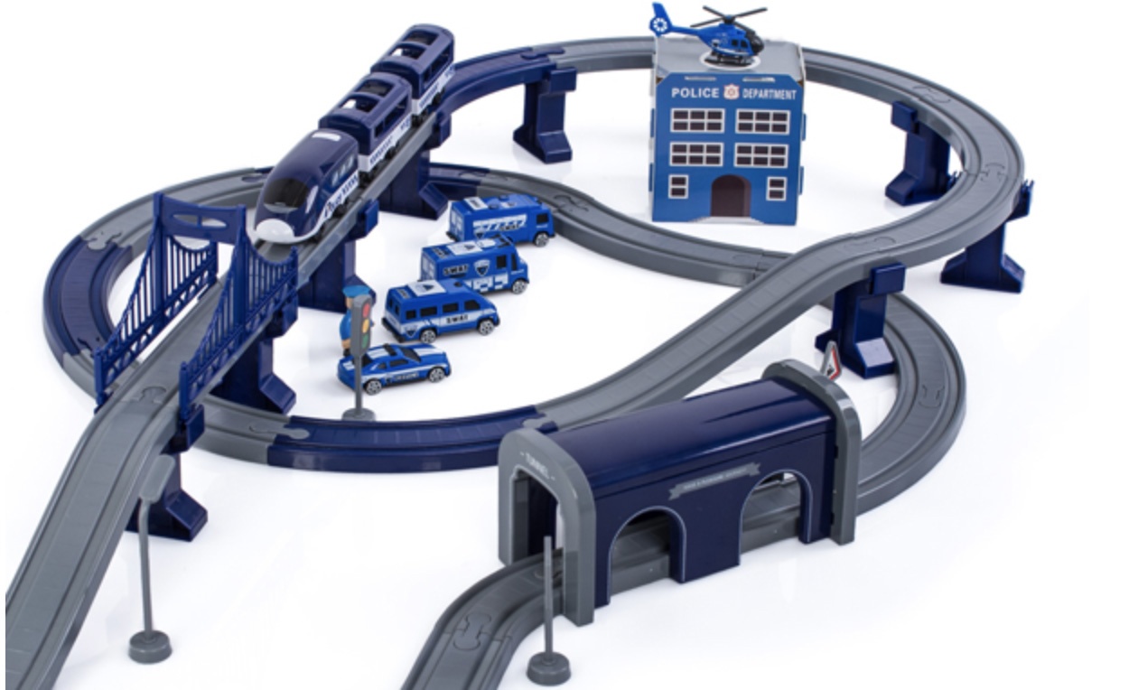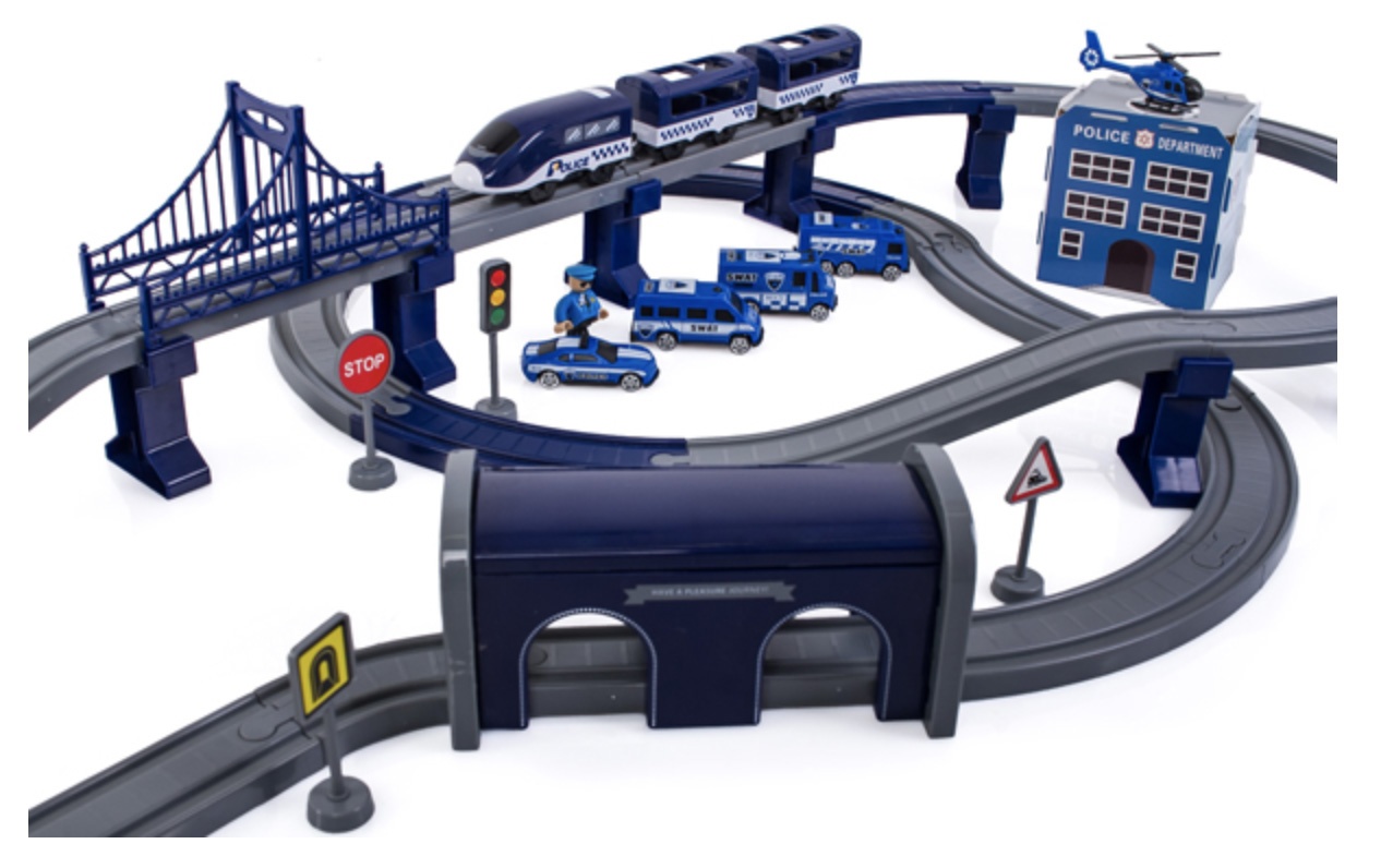 Влаковата писта 2в1 е комбинация от влакова писта и полицейски участък.влакова композиция с богати аксесоари от Aga4Kids.