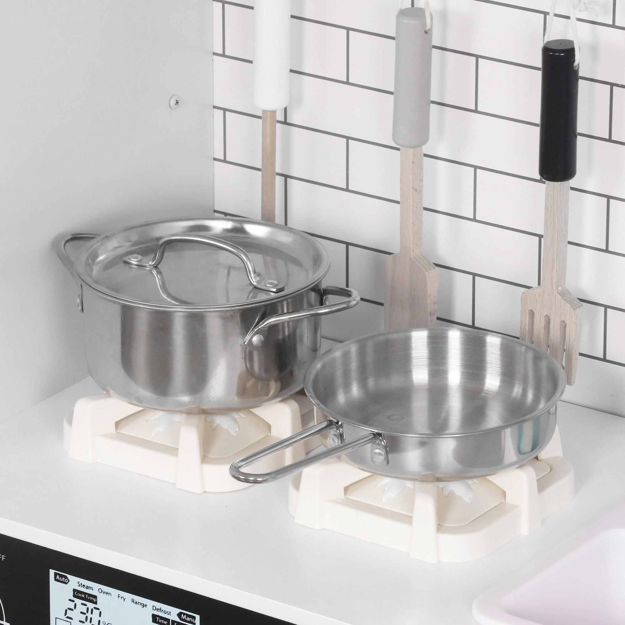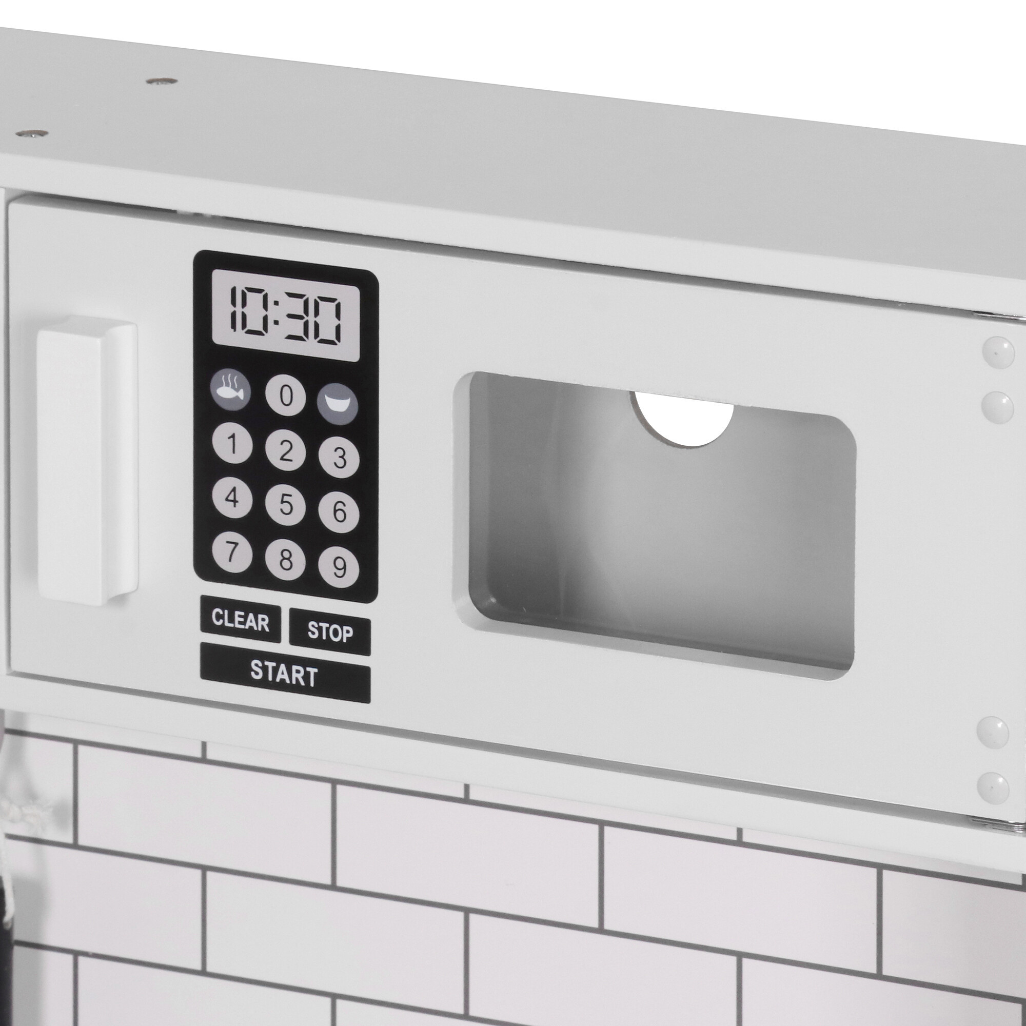 Кухнята е оборудвана с всички важни уреди, които децата познават от домакинството: фурна, микровълнова печка, котлон с плочи, абсорбатор и мивка. В горната част се намира традиционен абсорбатор, свързан с микровълнова фурна, която благодарение на светлинните и звукови ефекти изглежда много реалистично. Управляващите копчета на фурната издават типични щракащи звуци, така че децата да имат усещането за истинско печене и настройване на температурата. Към кухненския кът са включени също съдове, рафтове за тяхното съхранение и куки за окачване на кухненски прибори.