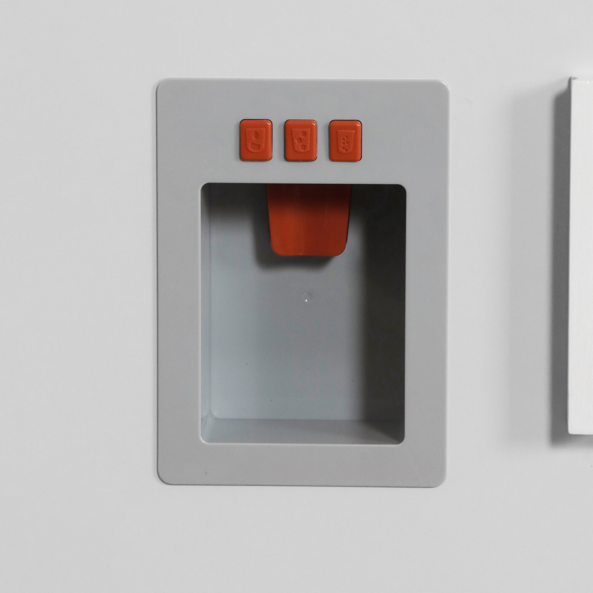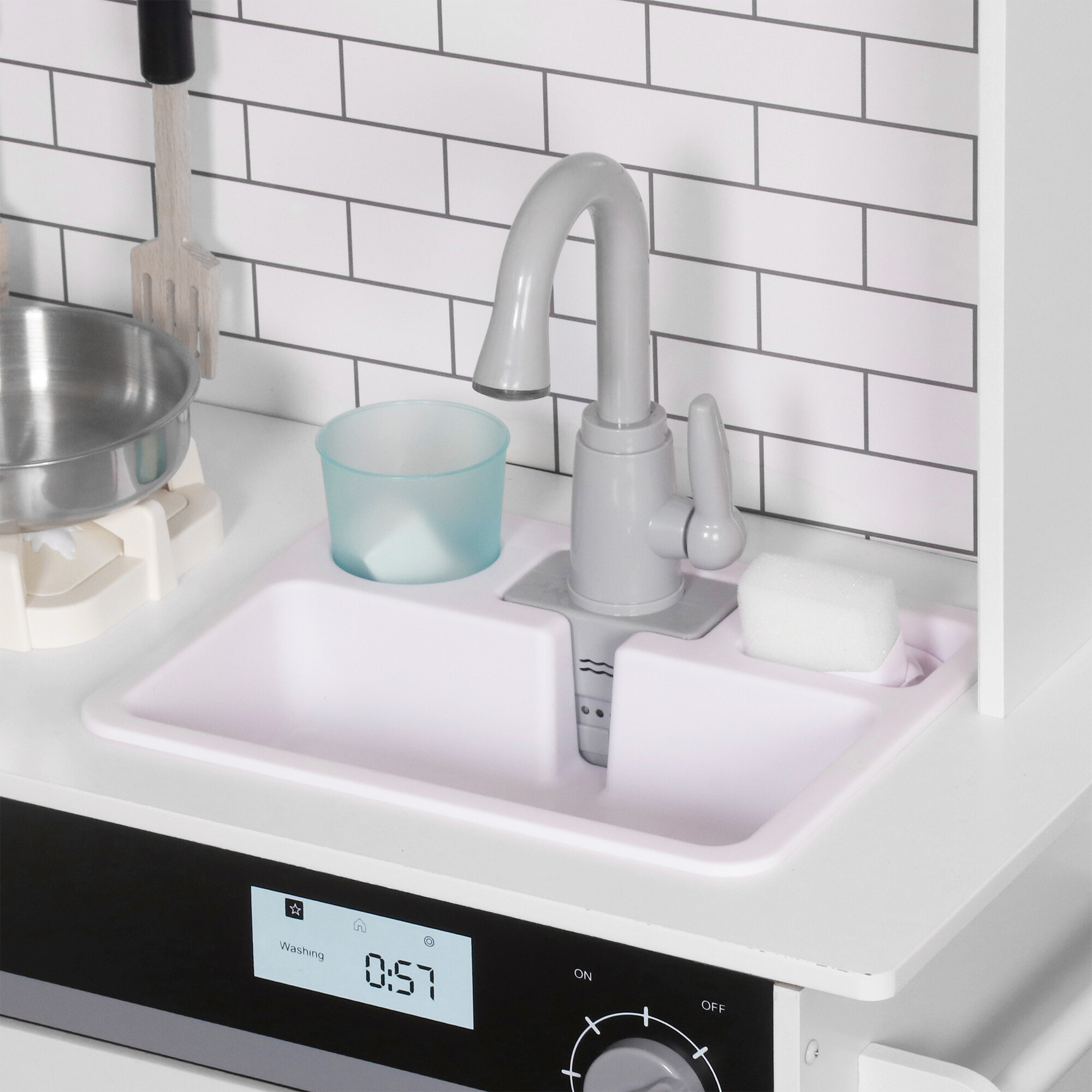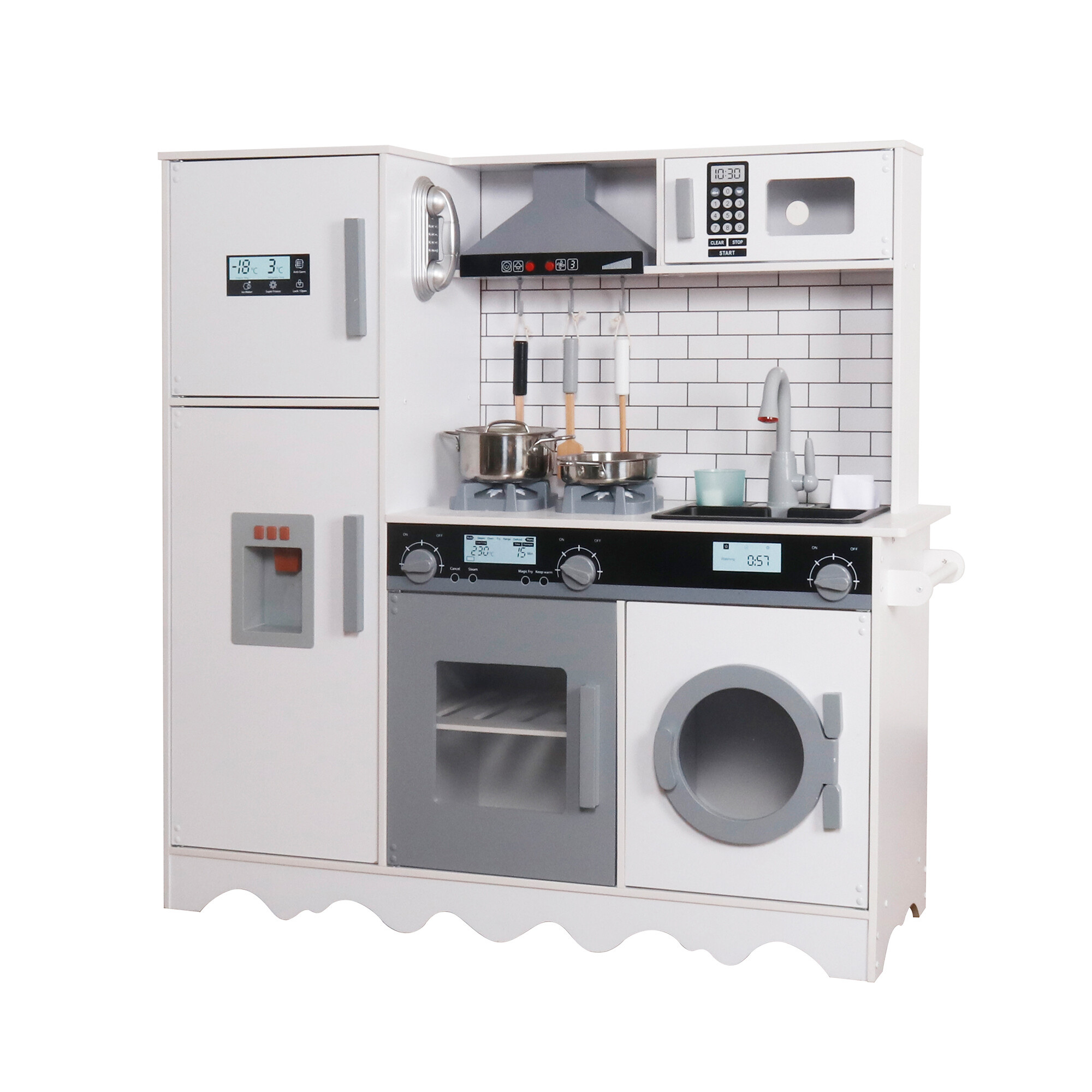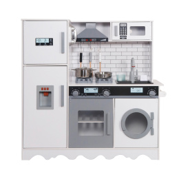 Модерният дизайн на кухненския комплект се допълва и от електронни функции, които още повече оживяват играта. Децата могат да използват машина за лед със светлинни и звукови ефекти, електрически аспиратор, микровълнова фурна и котлони, които при включване светят и издават реалистични звуци. Голямо привличане е и електрическата течаща мивка със светлинен ефект, благодарение на която децата могат да имитират истинско миене на съдове. Цялото оборудване се завършва с пералня, която свети и издава звуци на пране, така че децата да могат да изпробват и други домашни дейности.