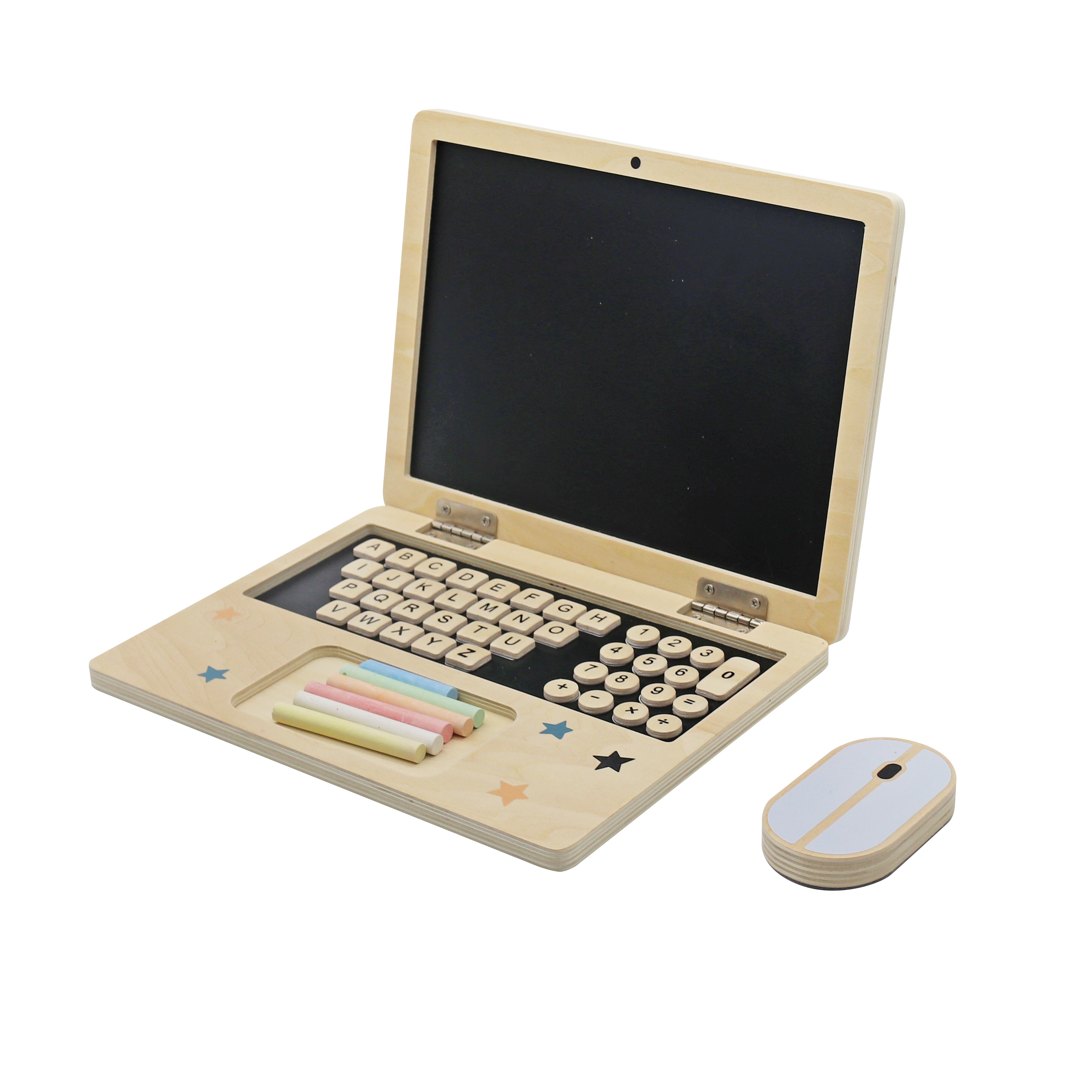 Долната част на мишката е покрита с филц, така че е перфектна като гъба за изтриване на дъската. Дървеният лаптоп позволява на децата да имитират своите родители, докато работят на компютър и кликат на клавиатурата.