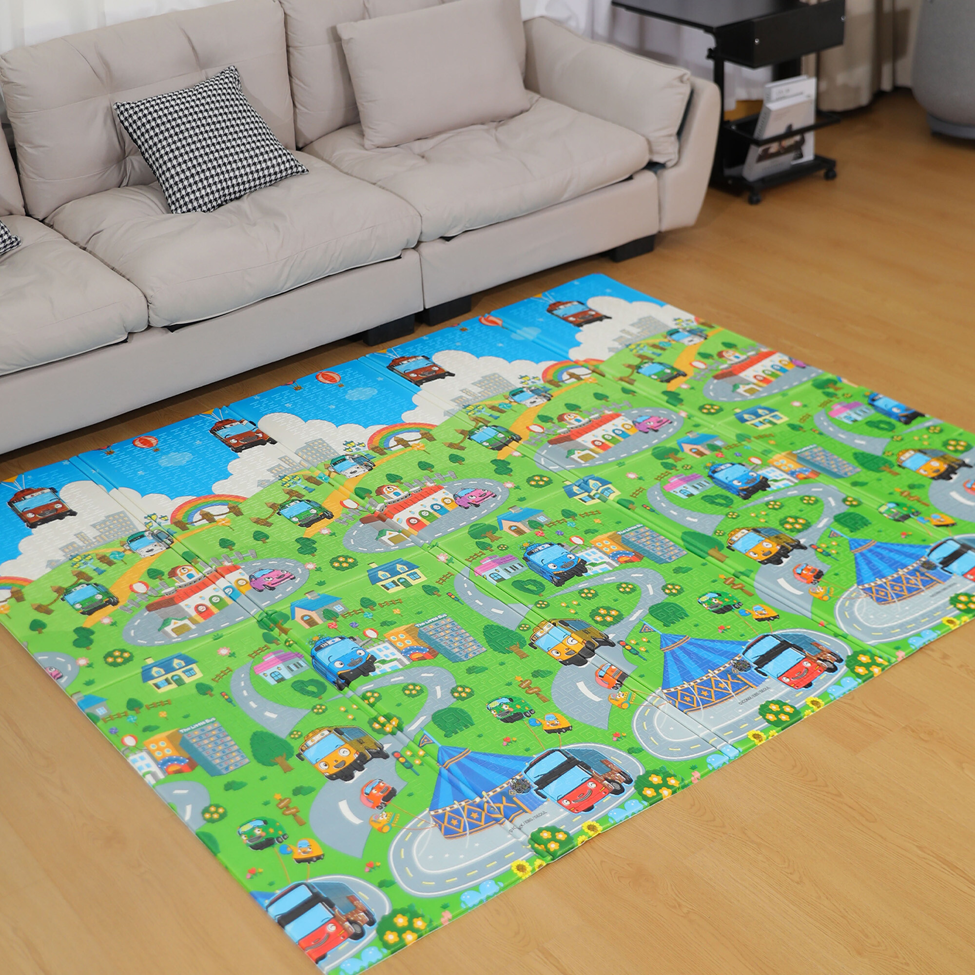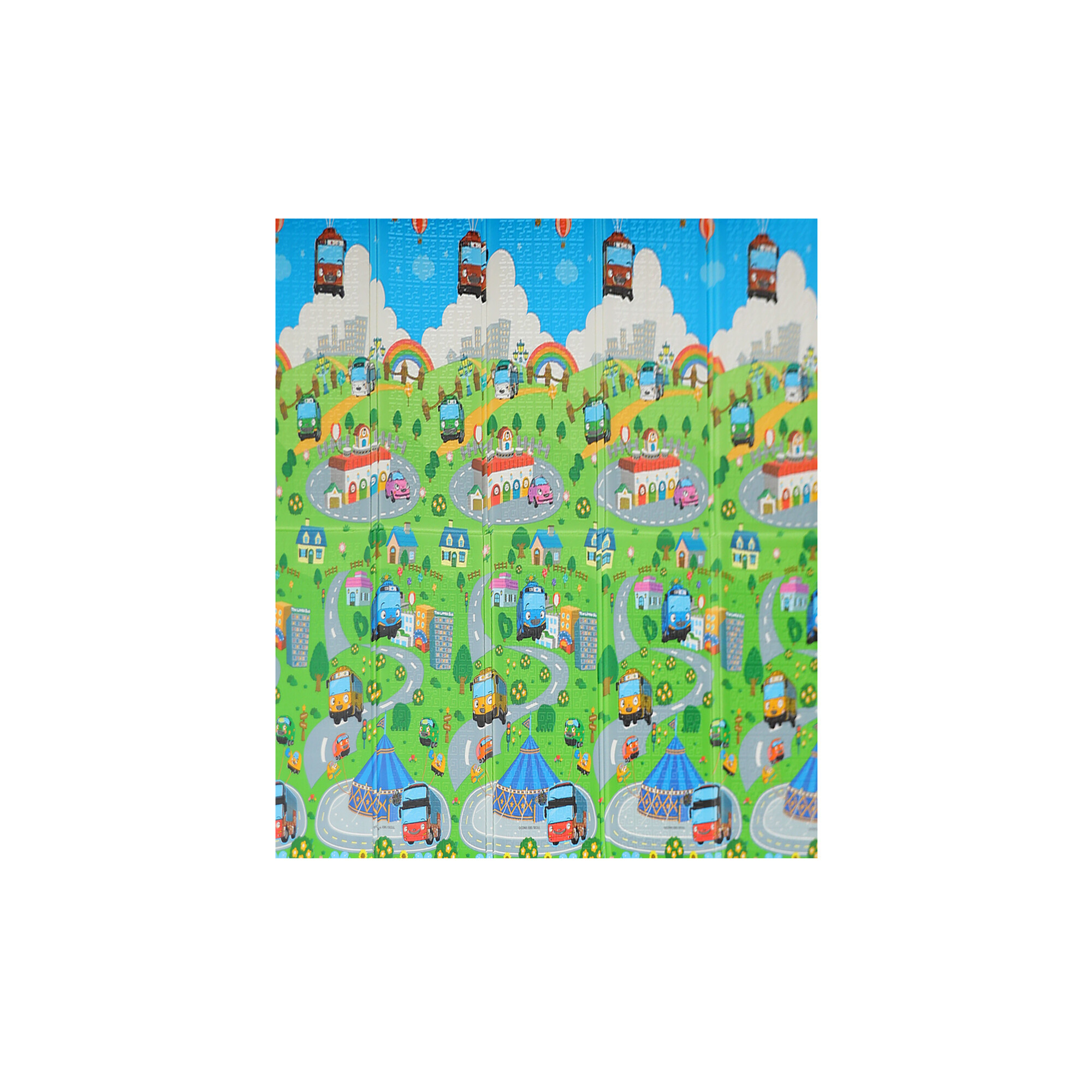 Игралната подложка има двустранен печат с весели мотиви и противоплъзгаща повърхност, която осигурява безопасността на всяка игра.