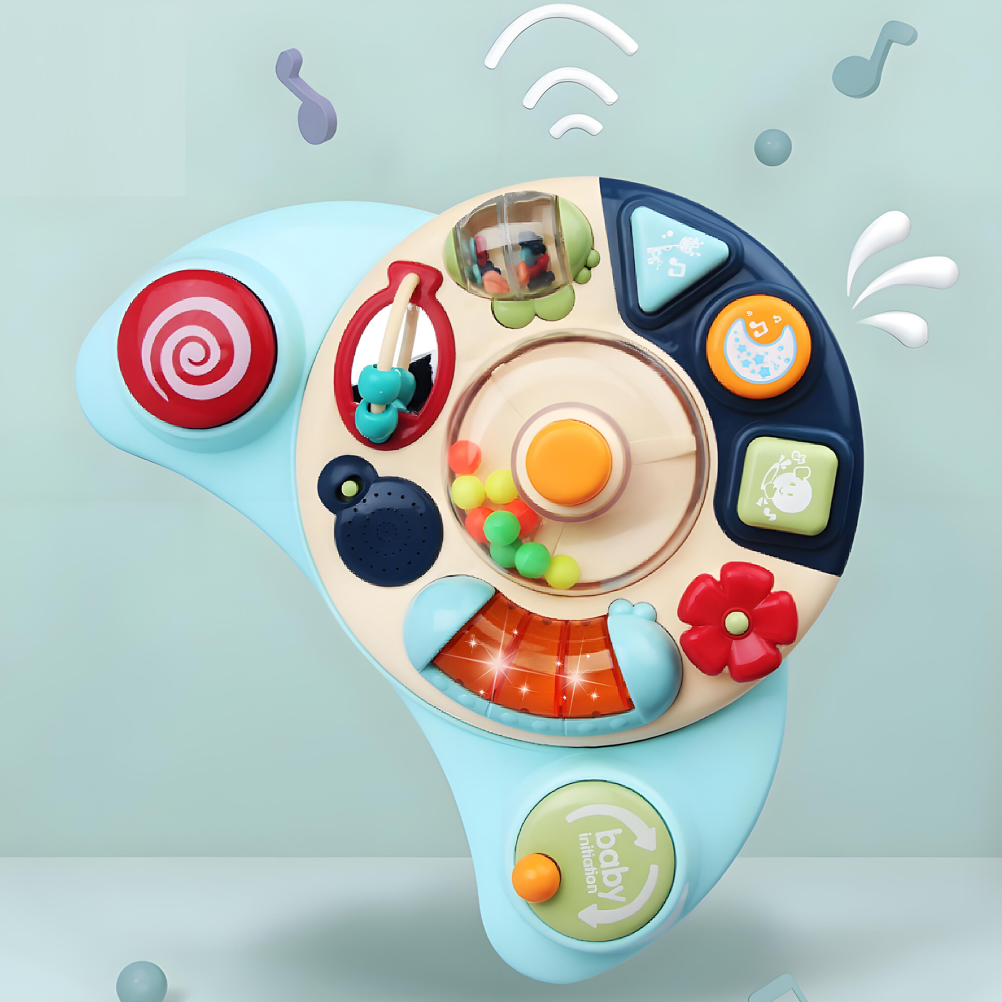 Всеки бутон и елемент на масичката е проектиран така, че да носи радост и същевременно да учи. Децата могат да се радват на - дрънкалка, огледалце, мъниста, въртящо се цветно бутонче, бутони, които издават звуци - на животни, музикални инструменти и мелодии с приспивни песни.