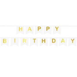 Бял транспарант със златен надпис Happy Birthday, идеален за детски рожден ден.