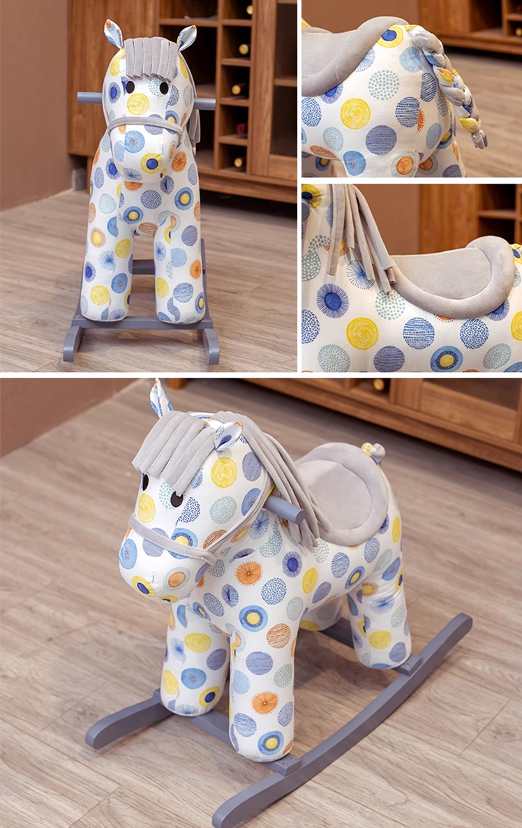 Характеристики и функции: Конят издава звуци на ръмжене, галоп и махане на опашка Играчката има седло със стремена, юзда и дървени дръжки Приятна плюшена материя Подвижна люлееща се рамка Здравите дръжки на шията и стремената на коня гарантират, че детето се чувства сигурно Батериите не са включени в комплекта на играчката