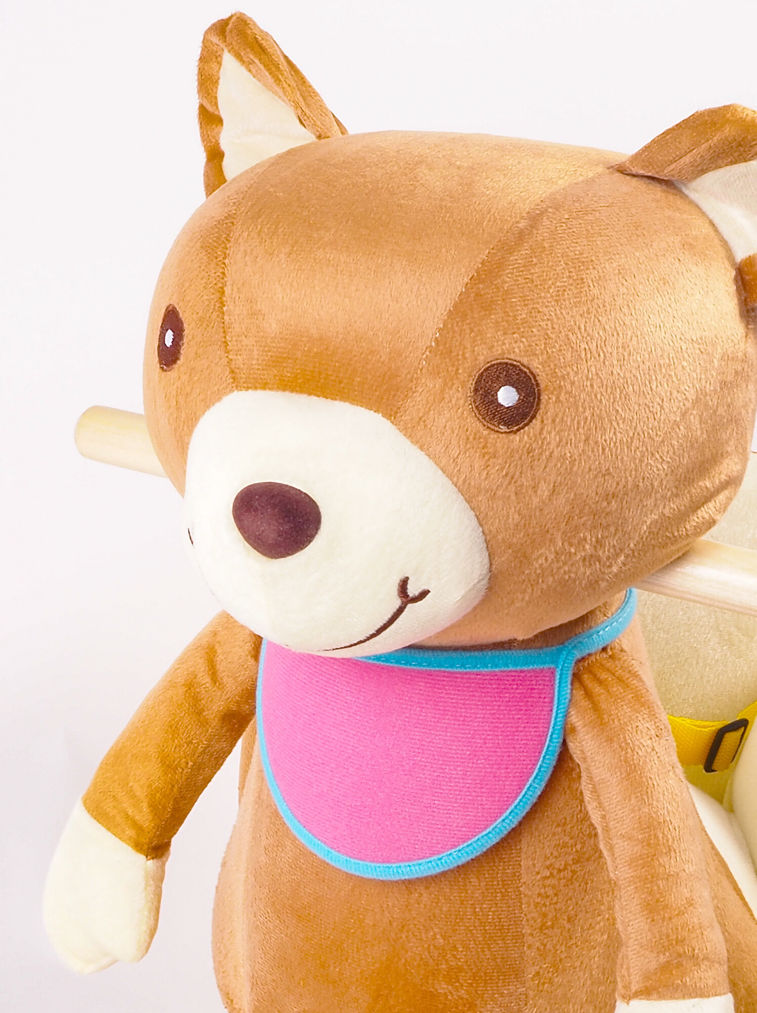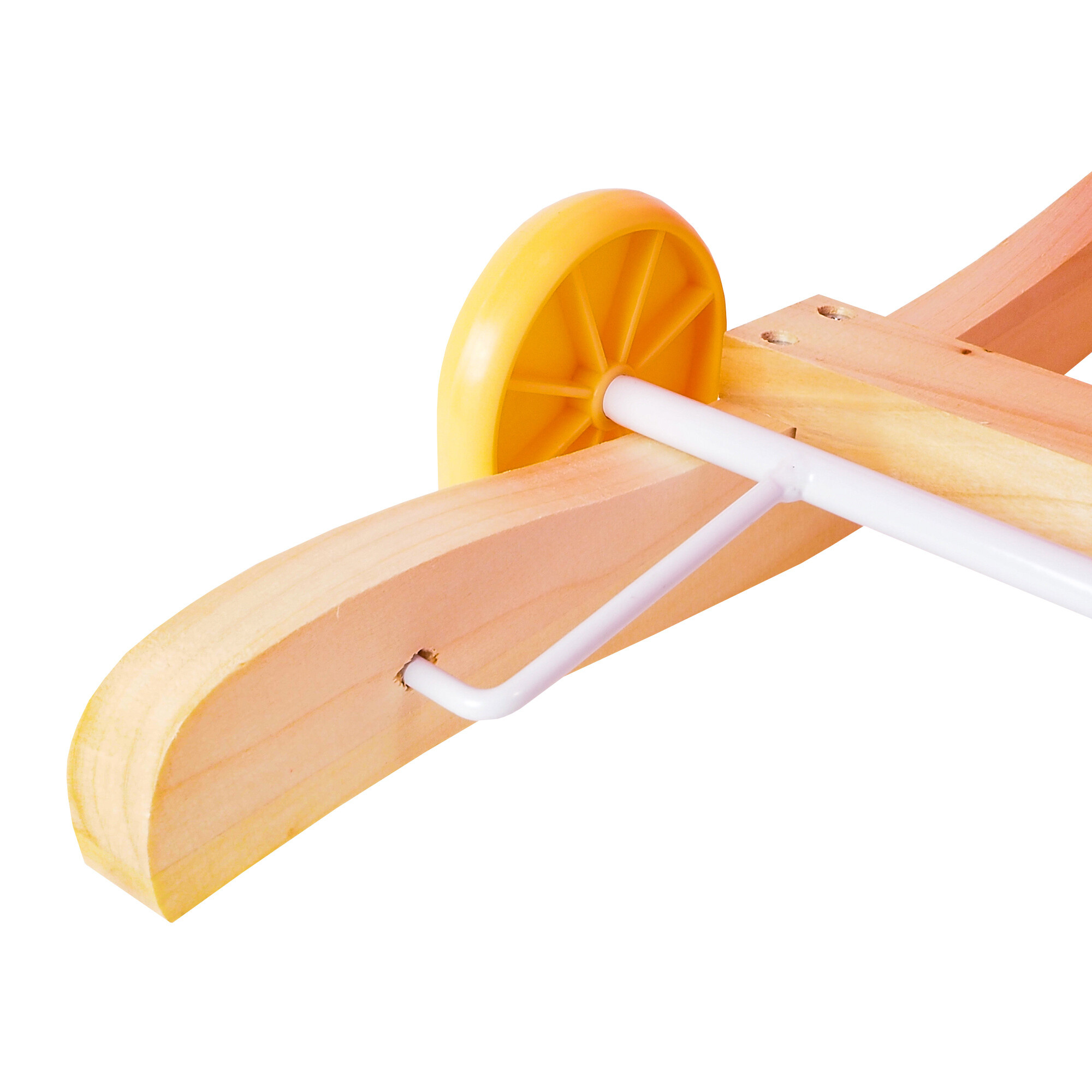 здравите дървени перила и дръжки помагат на детето да пази равновесие. Превъртете простия механизъм на релсите, за да разширите колелата и да превърнете люлеещата се играчка в яздещ Бамби за секунди.