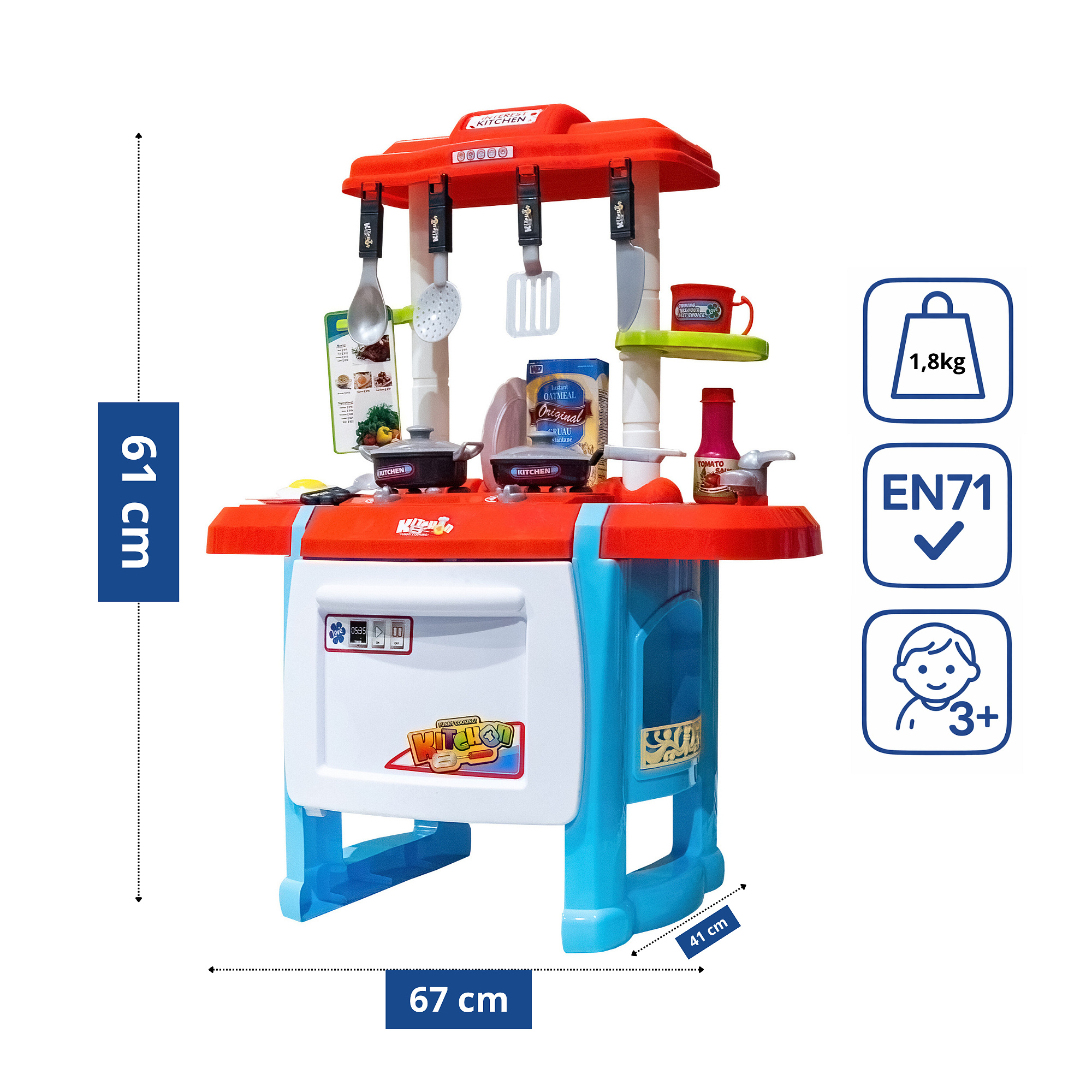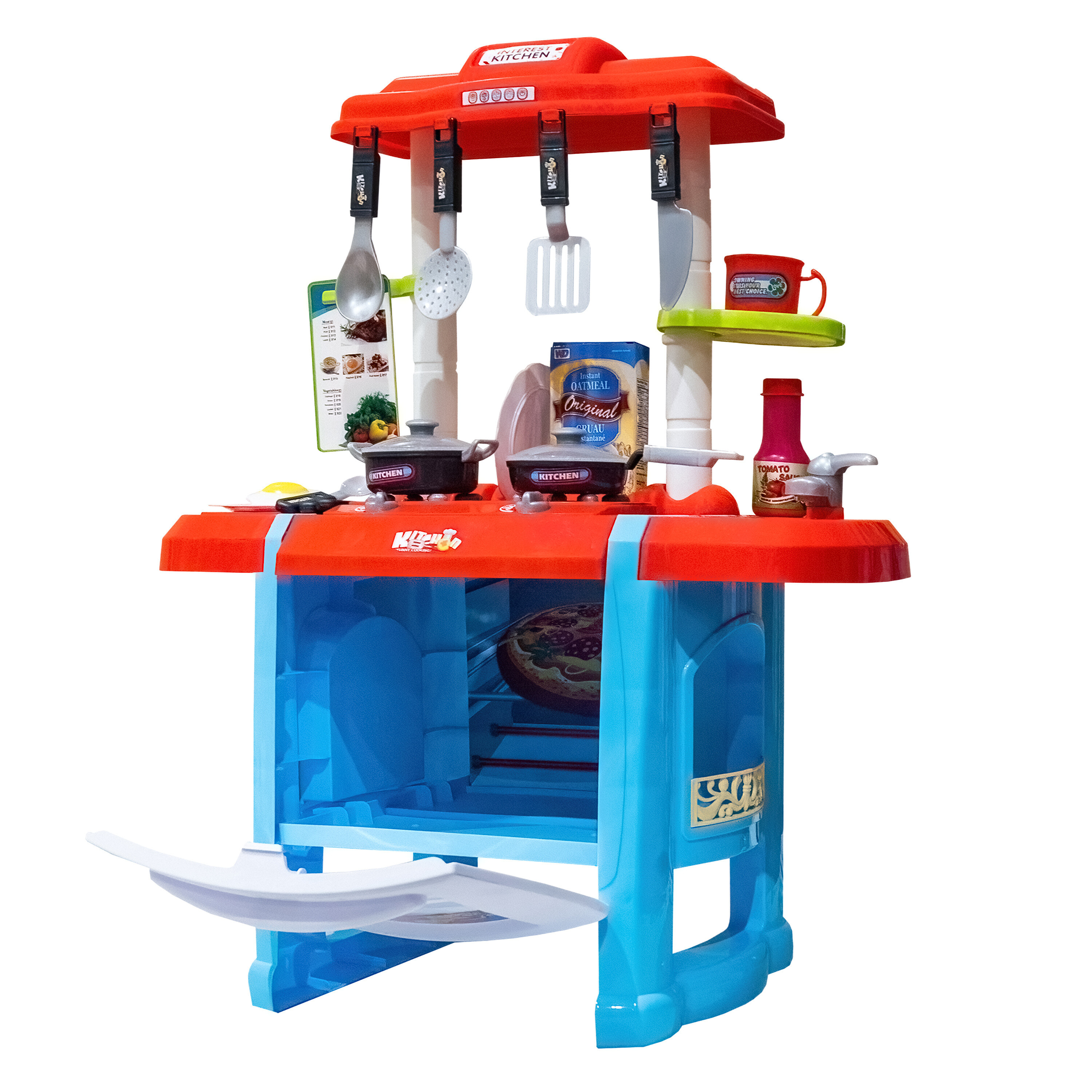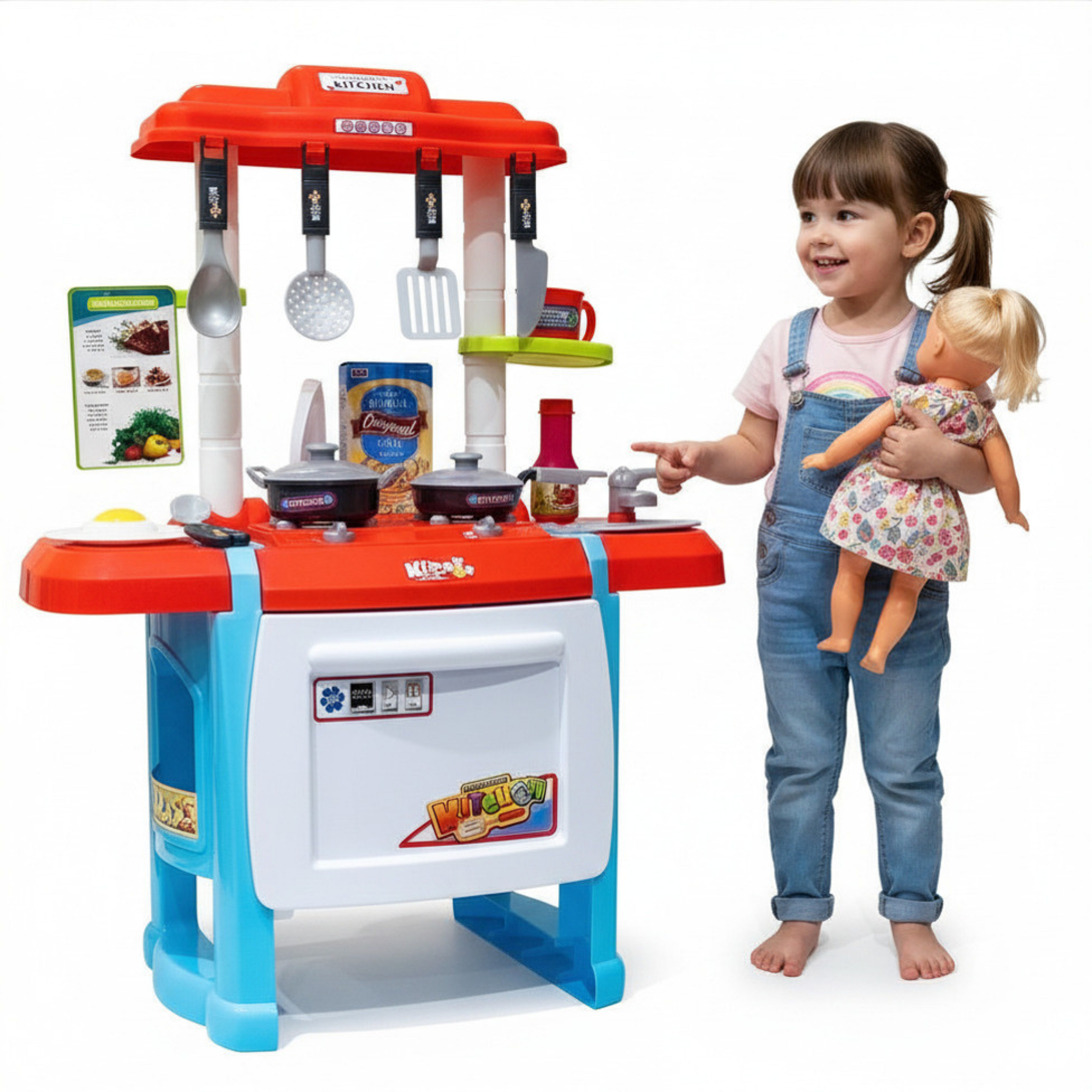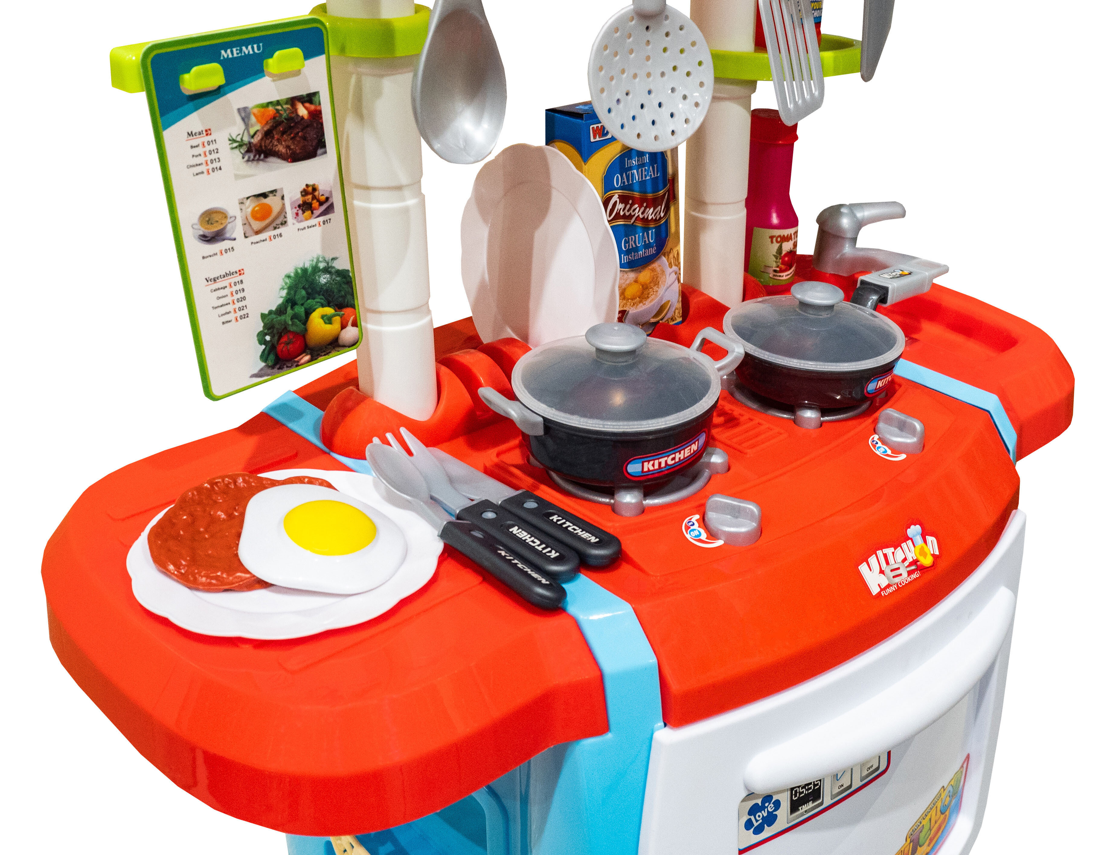- Съдържа много различни аксесоари като тенджера, тиган, капаци, чинии, кухненски прибори, чаша, храни и др.
