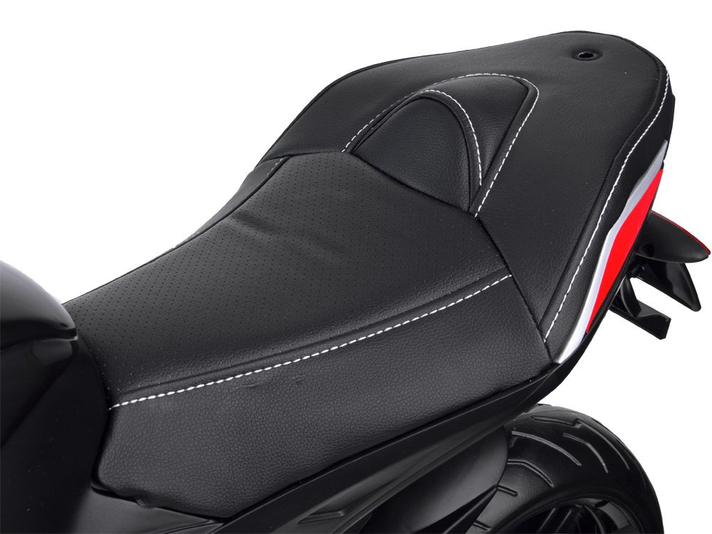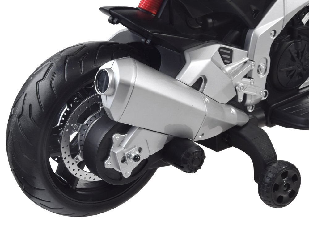 Мотоциклетът се стартира с ключ. Има удобно седло, тапицирано с еко кожа, светещи светлини и странични колела за баланс и комфортно каране.Състезателят със сигурност ще донесе много забавление на всеки малък шофьор.