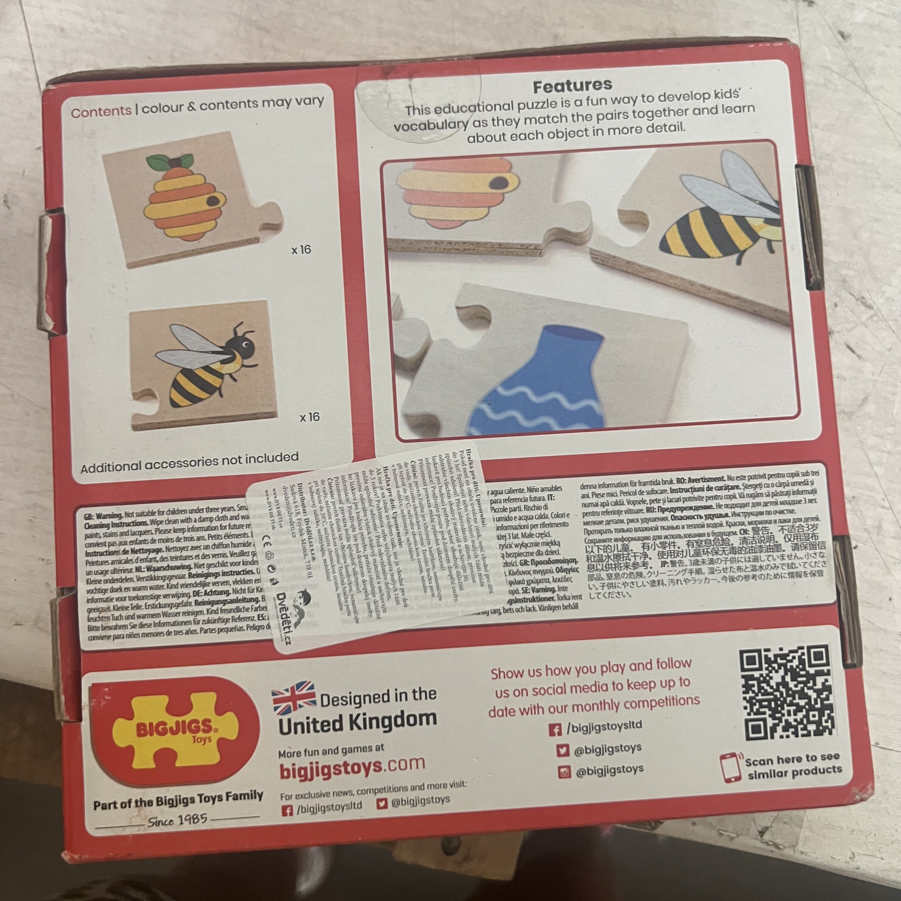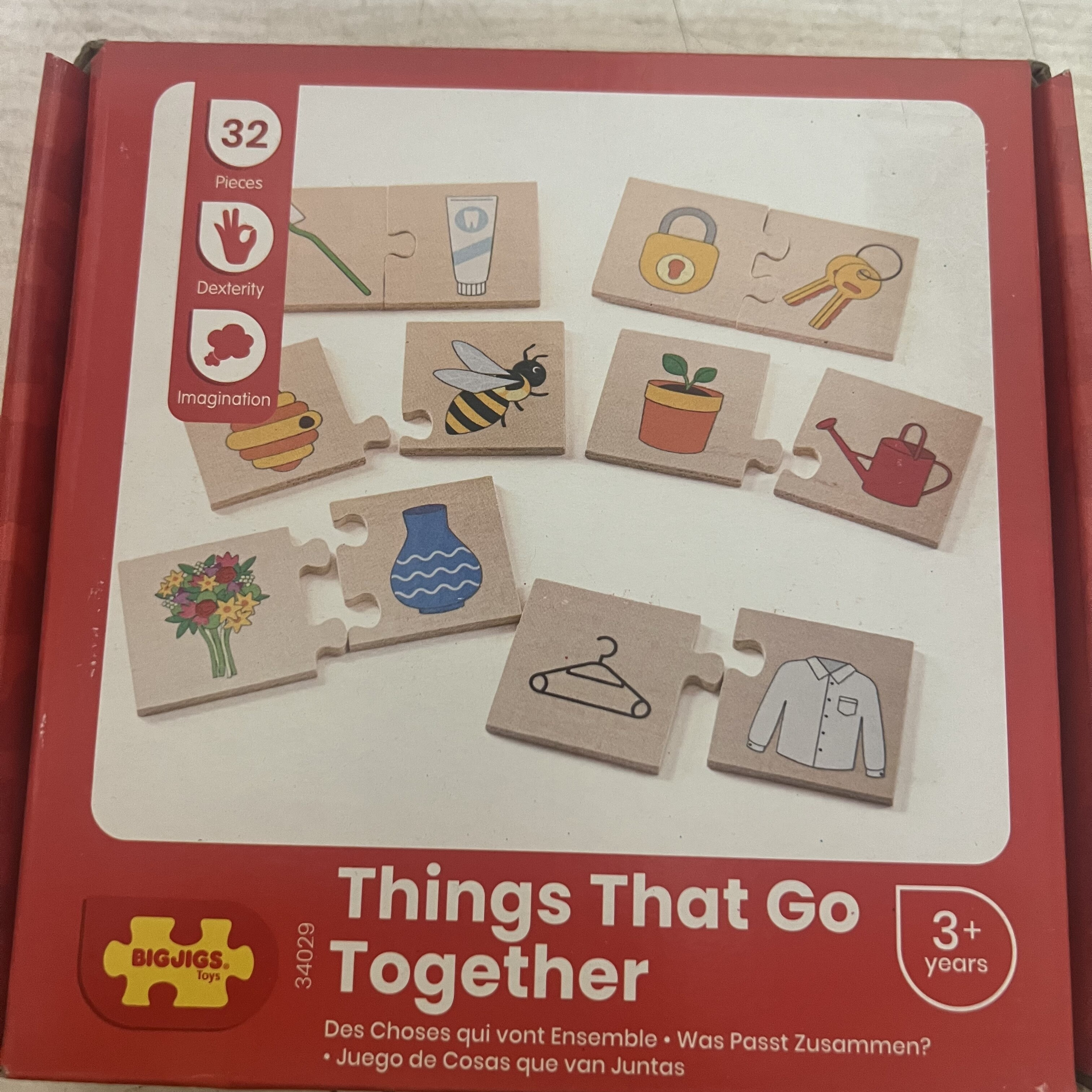 Пъзелът Какво си подхожда учи децата за различни ежедневни предмети, които си подхождат.С какво се допълва земният пчелен?А какво ще кажеш за катинар?Тази образователна пъзел игра е забавен начин за развиване на речника на децата, докато свързват двойки и се учат по-подробно за всеки предмет.Гладките здрави парчета от пъзела имат идеален размер за малки ръчички, за да могат да ги хващат, поставят и изследват.Изработено от първокласна, отговорно добита дървесина и боядисано с нетоксични бои и лакове.Отговаря на актуалните европейски стандарти за безопасност. Изработено от висококачествени, отговорно добити материали.Размери: 6x5,9x0,6 см