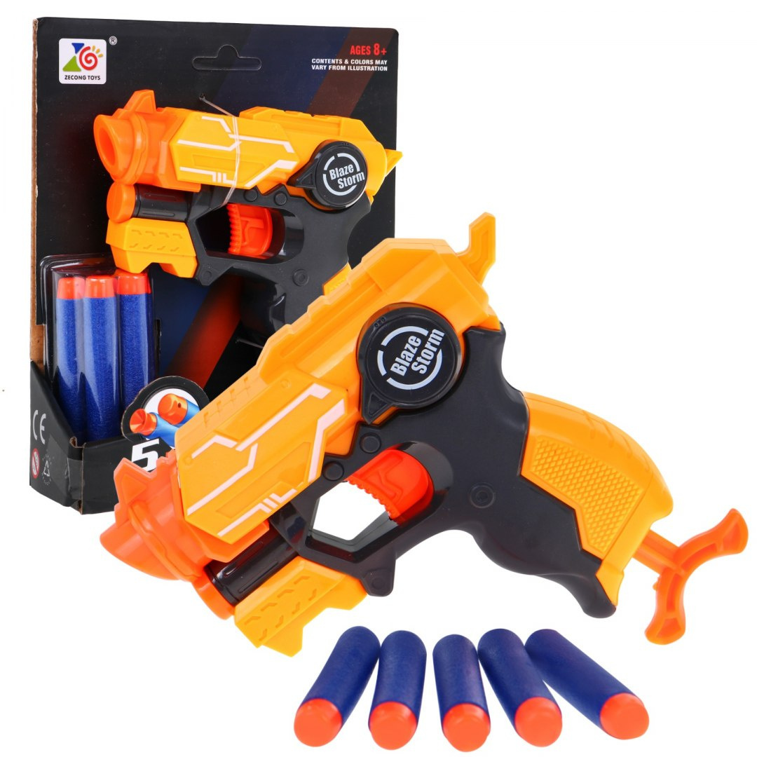 Blaze Storm е компактно, лесно за използване оръжие. Играчката не изисква батерии. Просто поставете патрона в цевта, издърпайте лоста надолу и натиснете спусъка. Стрелите са от мека пяна с гумен връх и летят много далеч. Благодарение на малките си размери, оръжието може да се вземе буквално навсякъде.