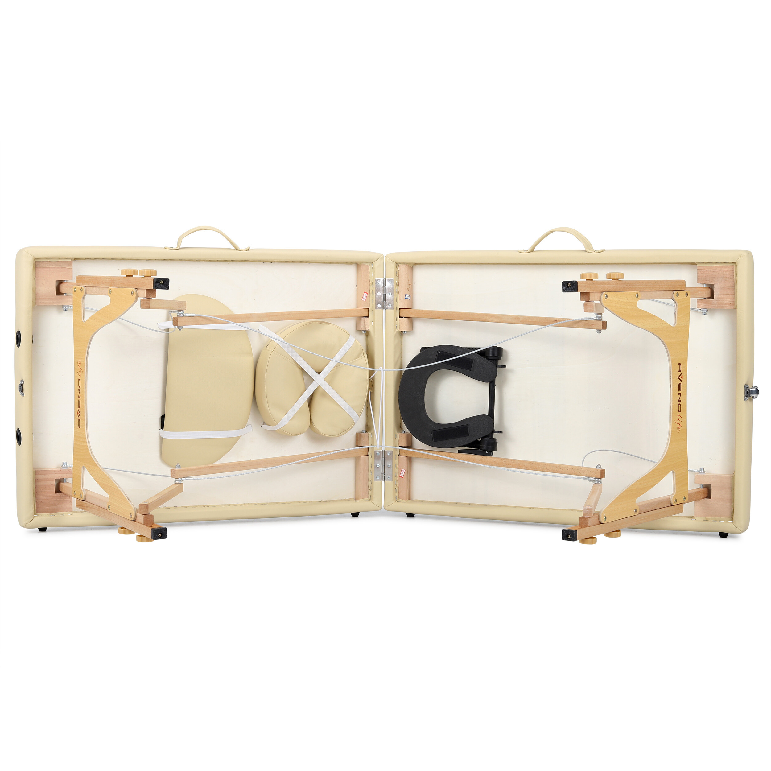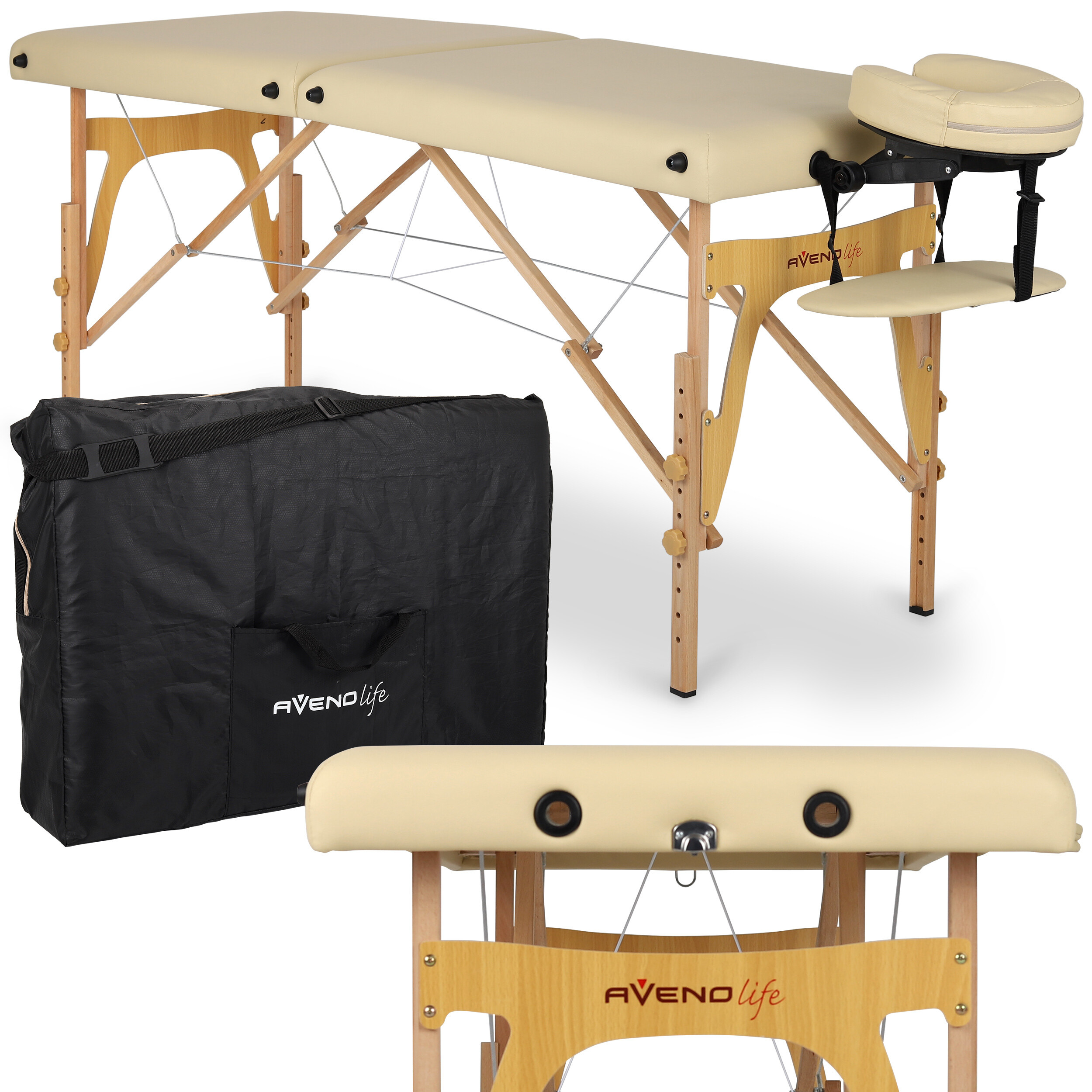 Безопасността и стабилността са ключови при масажа. Дървеното масажно легло е оборудвано с противоплъзгащи крачета, които осигуряват стабилно поставяне на всякаква повърхност. Регулируемата височина на кушетката позволява да се адаптира нейната височина според нуждите на масажиста, което осигурява ергономична и удобна работа. Благодарение на усилването с помощта на стоманени въжета и закрепващи колчета на всеки подпорен крак, е в състояние да издържи товар до 250 кг.