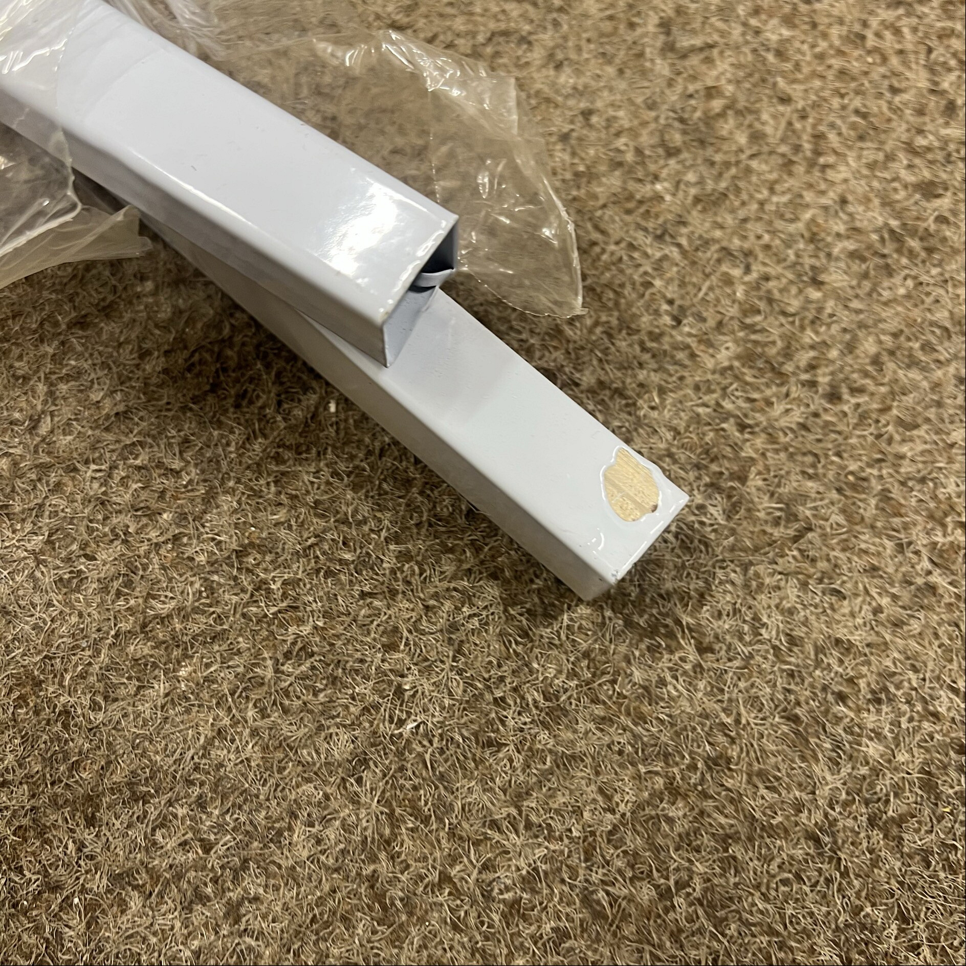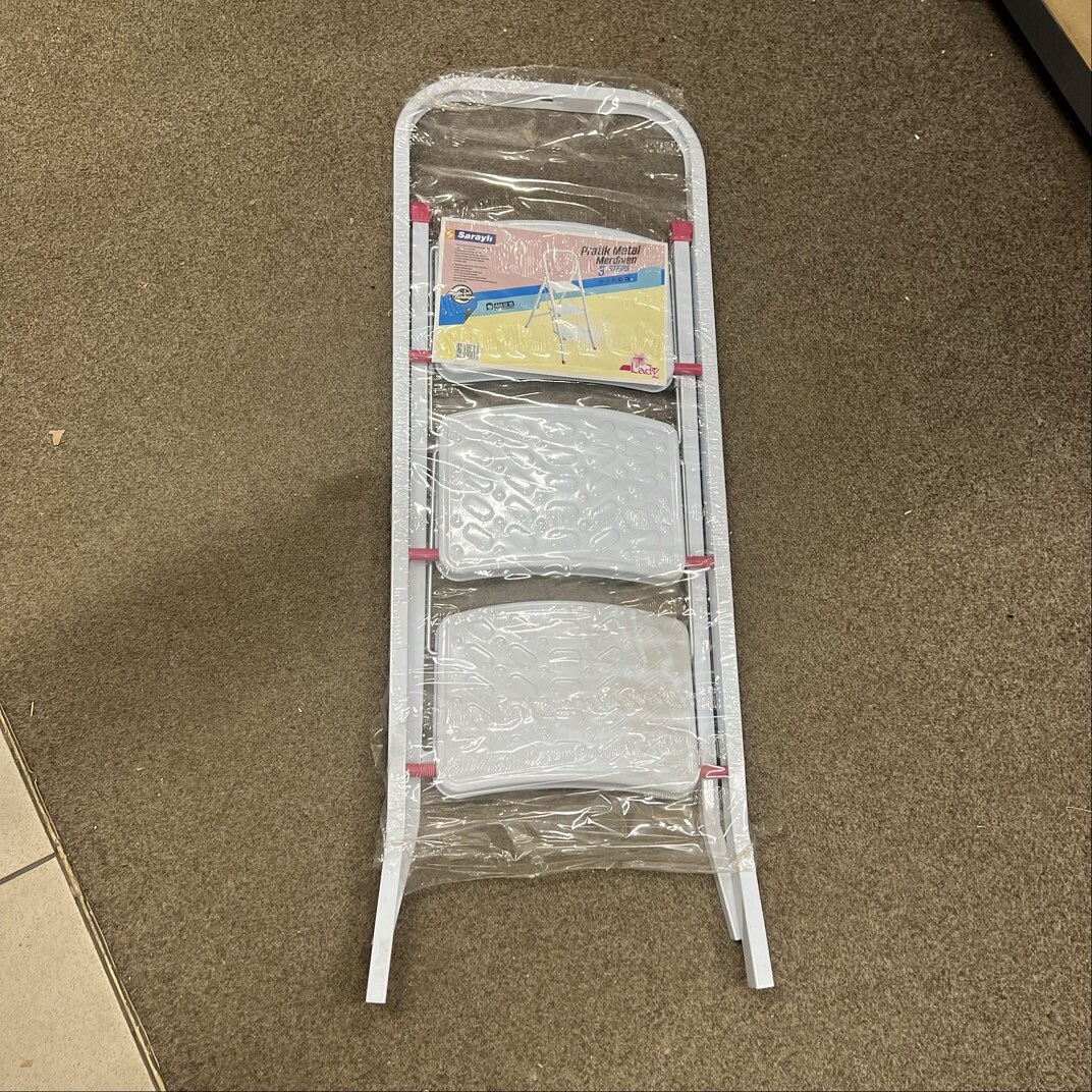Тази стълба е напълно използваема, но има на няколко места надраскан лак. Единият от краката е леко вдлъбнат на върха и липсват капачките на краката.