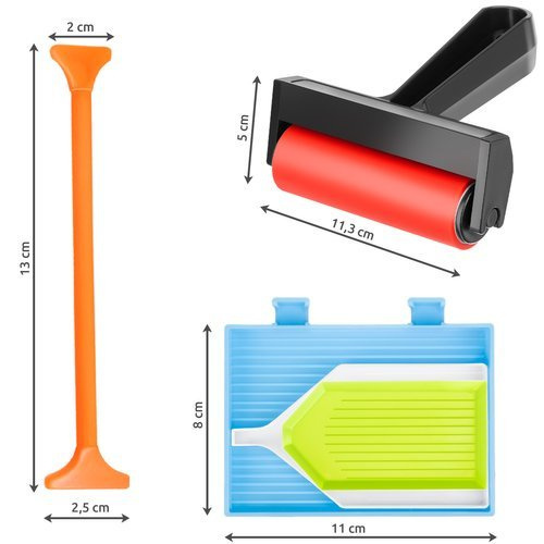 ВЪЗМОЖНОСТ ЗА ПРЕЦИЗНО РИСУВАНЕ НА КАРТИНИ - комплектът за диамантена бродерия е изключително практичен аксесоар, съдържащ между другото валяк за пресоване на диаманти, който ги пресова перфектно, като същевременно помага за залепване и изравняване на покритата с тях повърхност.