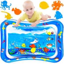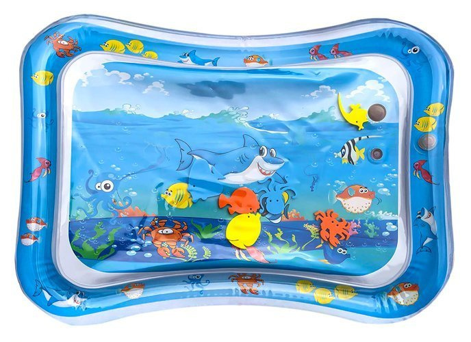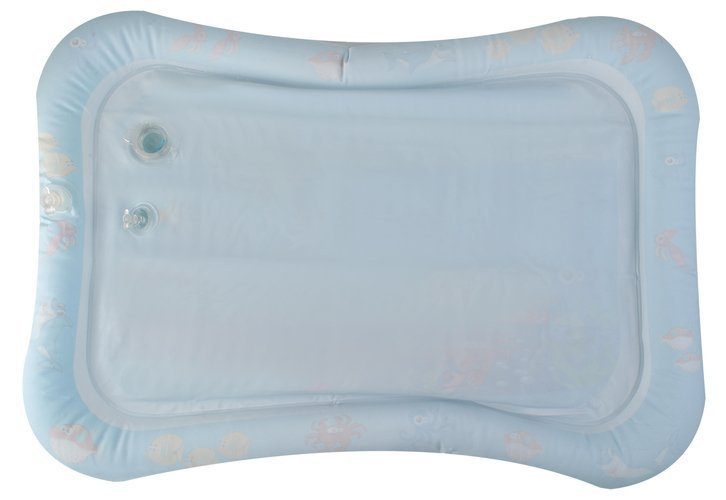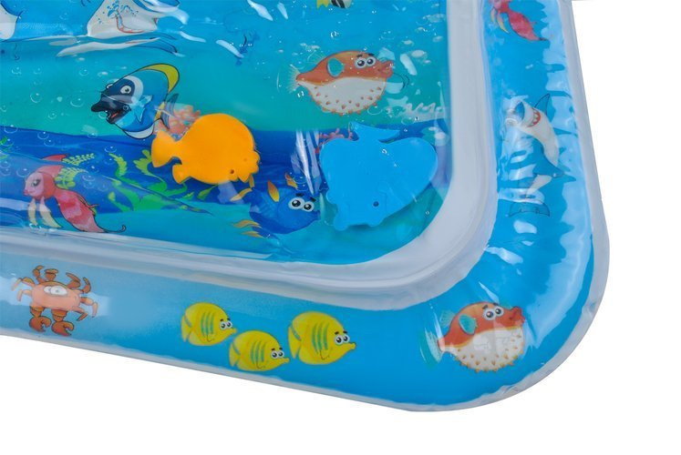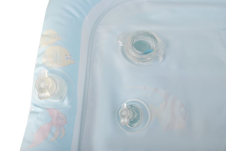 НАДУВАЕМА ВОДНА ПОДЛОЖКА - уникална водна подложка за бебета Е изработена от висококачествена пластмаса, която гарантира изключителна издръжливост. Ръбът на подложката трябва да бъде напомпан с въздух, а средата напълнена с вода. Когато е сгъната, заема малко място, което означава, че можете да я вземете на пътуване или почивка с детето. Вътре бяха поставени цветни водни животинки, които ще се движат под влиянието на движенията на детето, което лежи върху нея. Много лесно се почиства, достатъчно е да го избършете с влажна кърпа и е готов за игра!