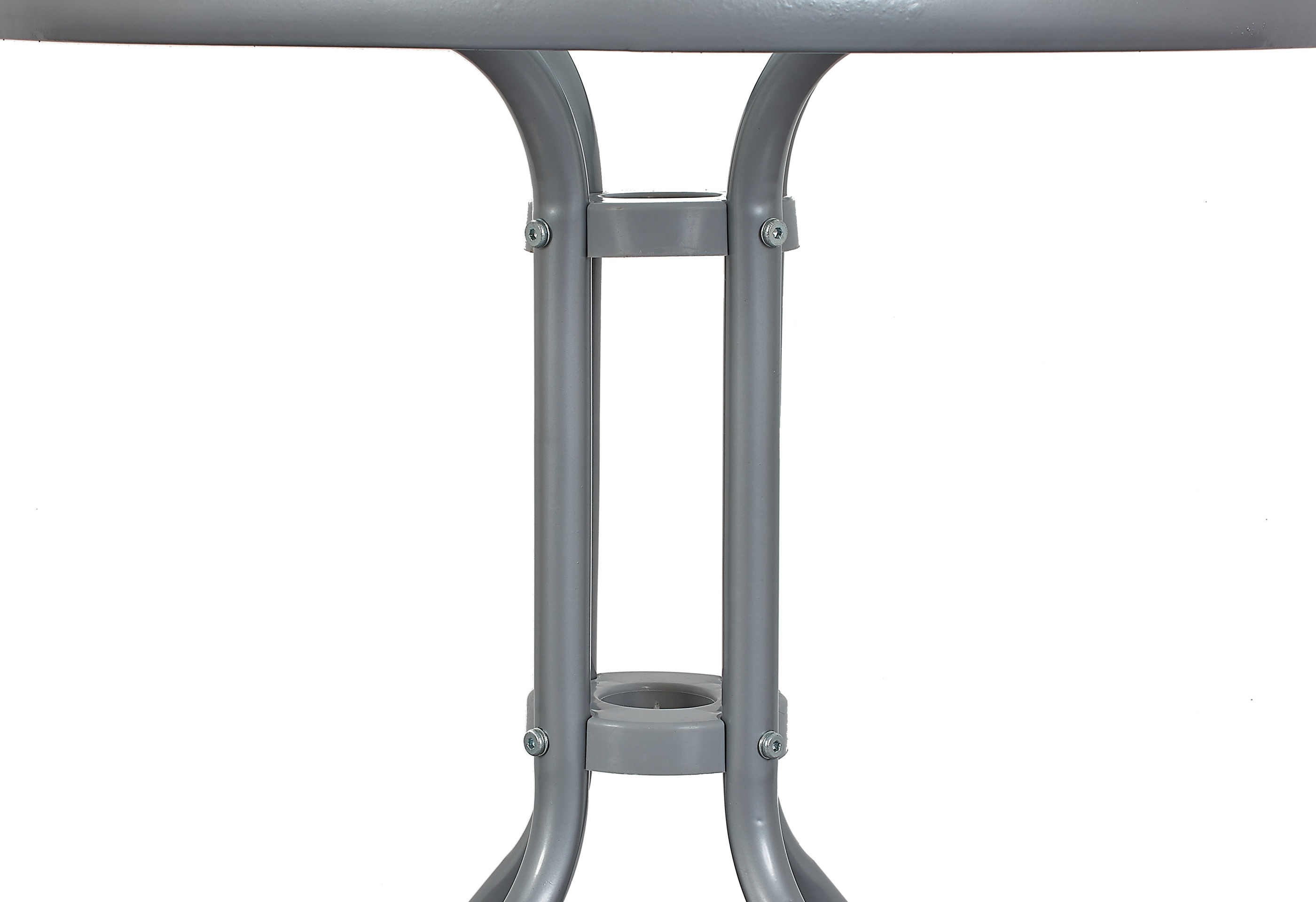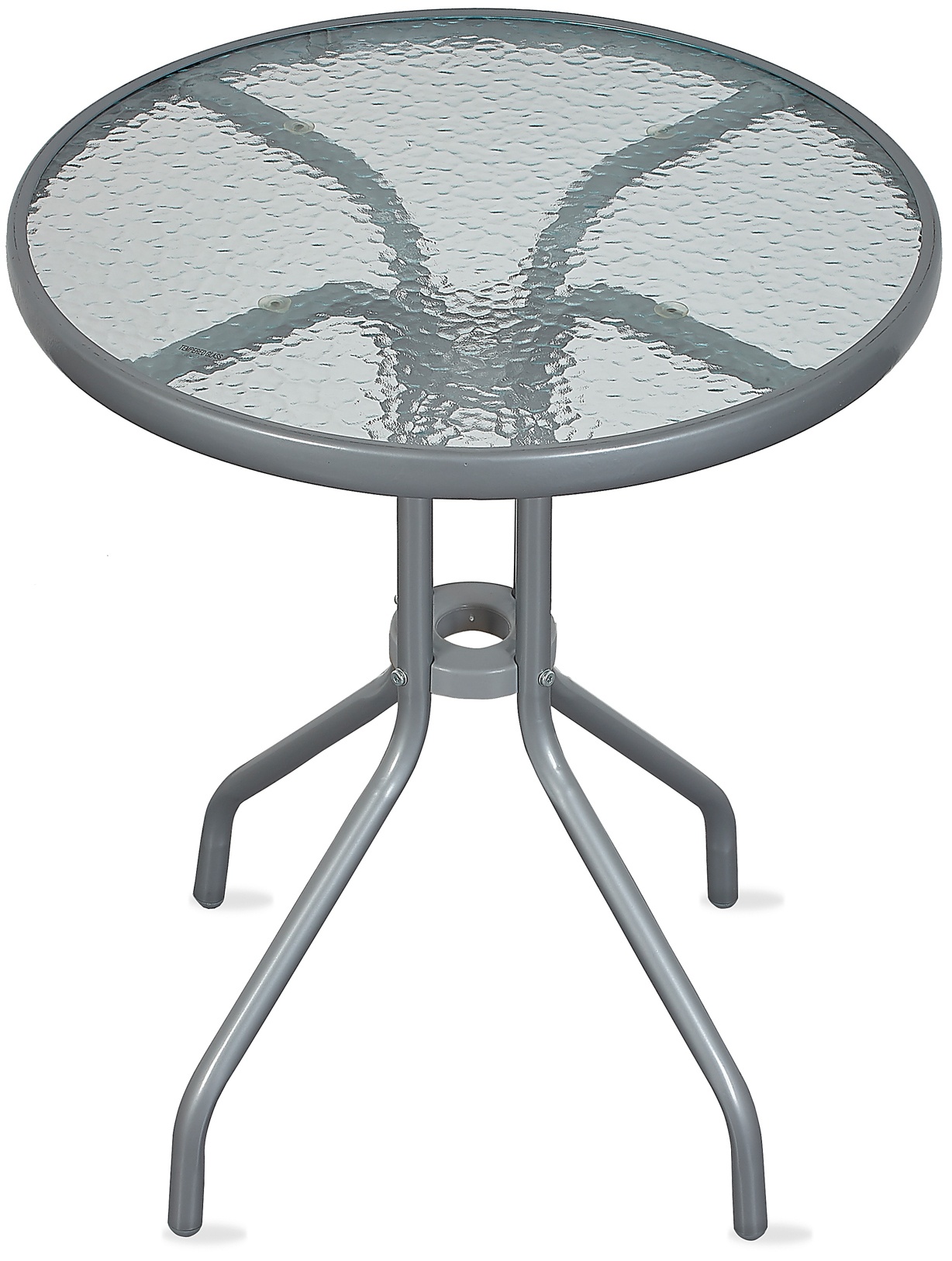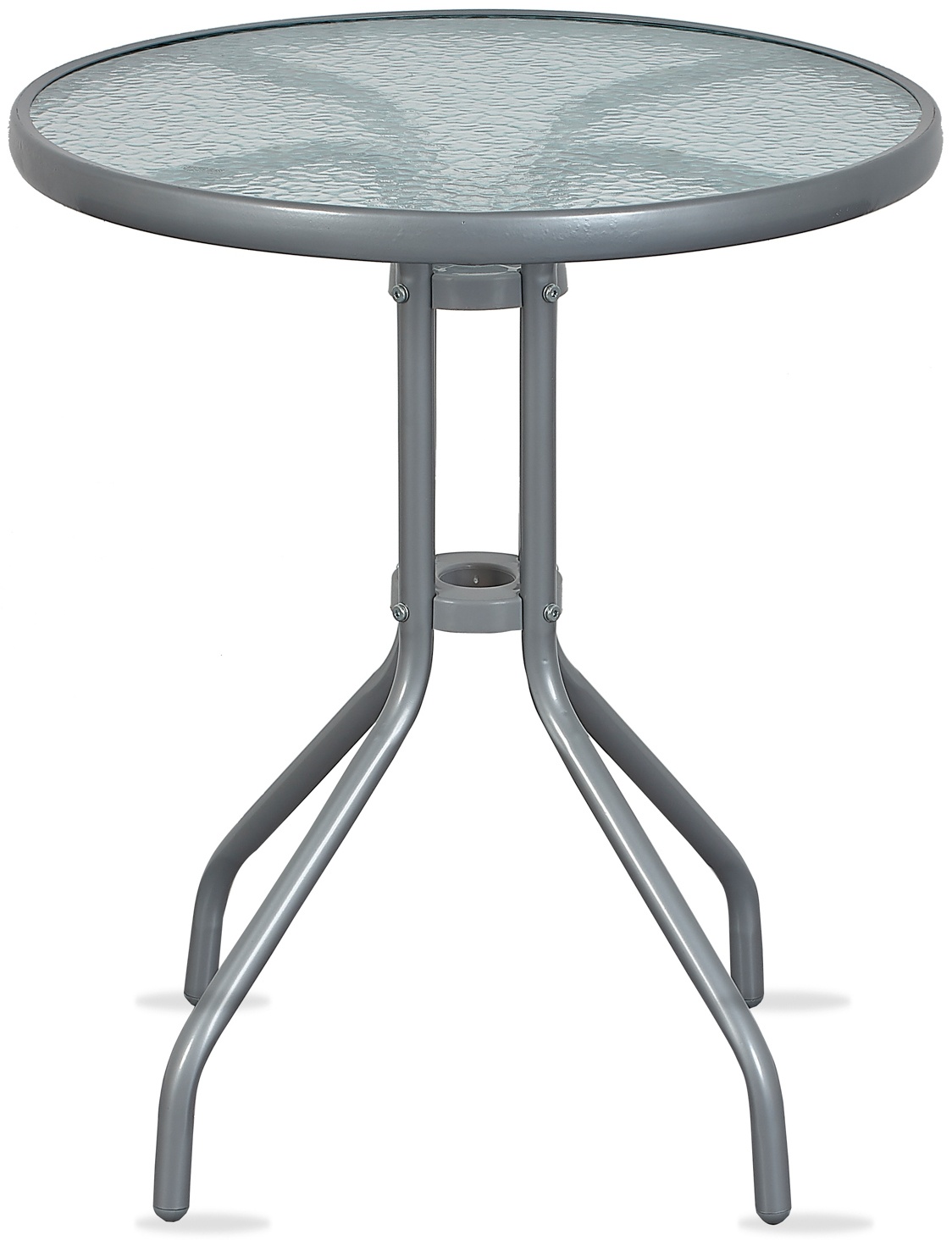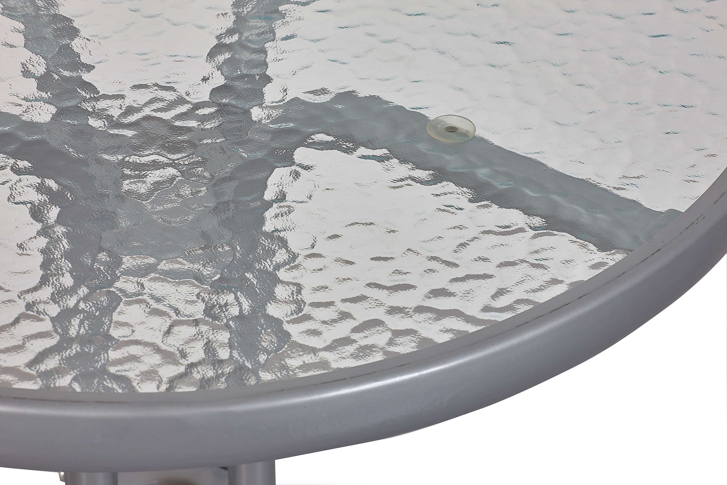 Градинска маса с масивна метална рамка и стъклен плот с оребрени ръбове с модерен дизайн, подходяща за градини, тераси, кафенета, беседки, балкони или плажове.