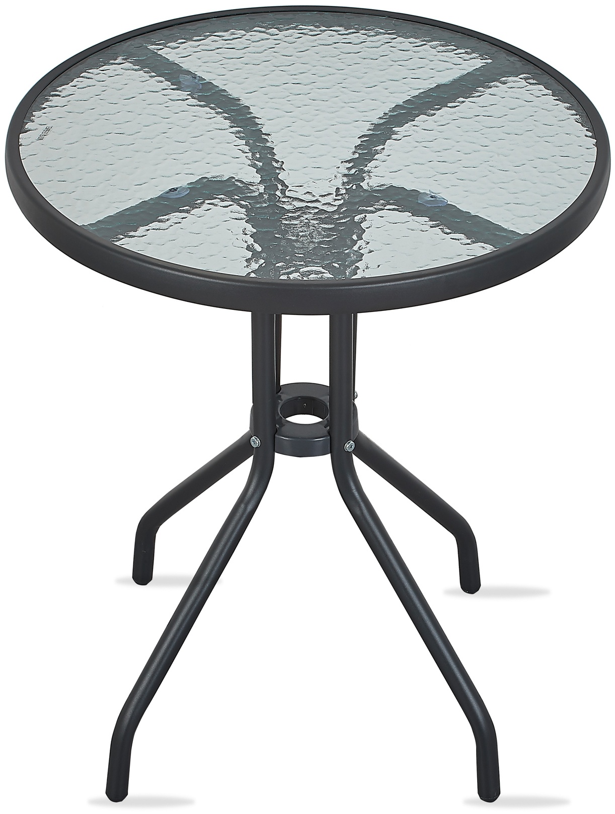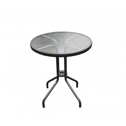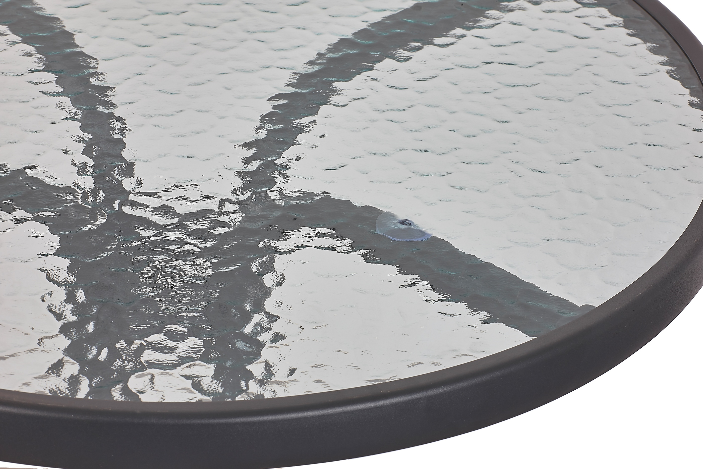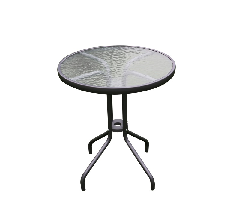 Градинска маса с масивна метална рамка и стъклен плот с оребрени ръбове с модерен дизайн, подходяща за градини, тераси, кафенета, беседки, балкони или плажове.