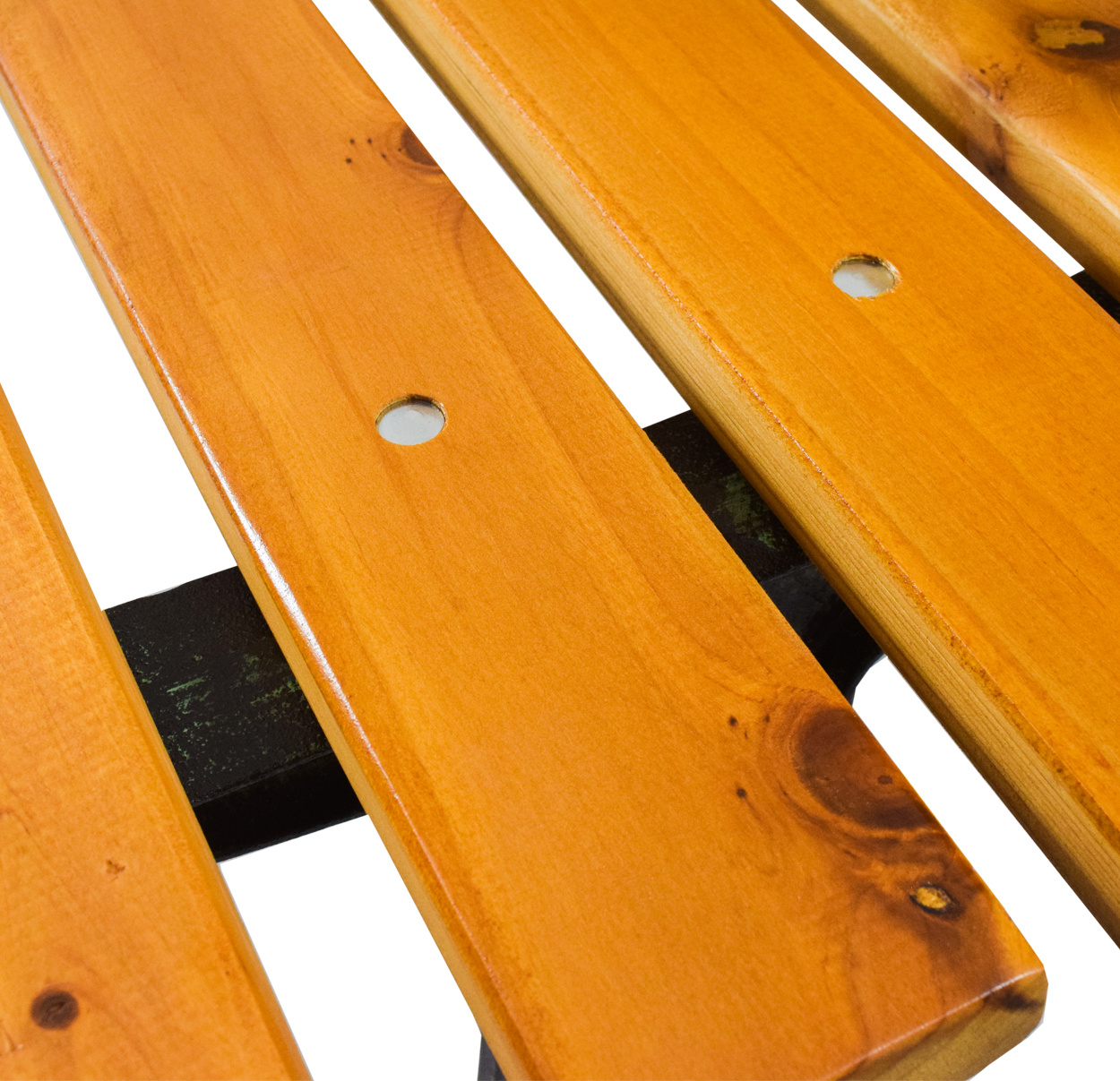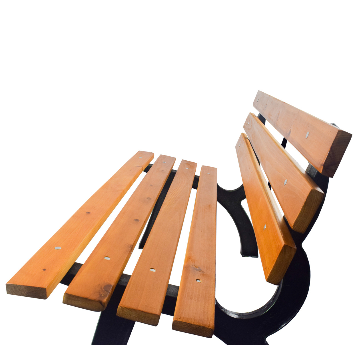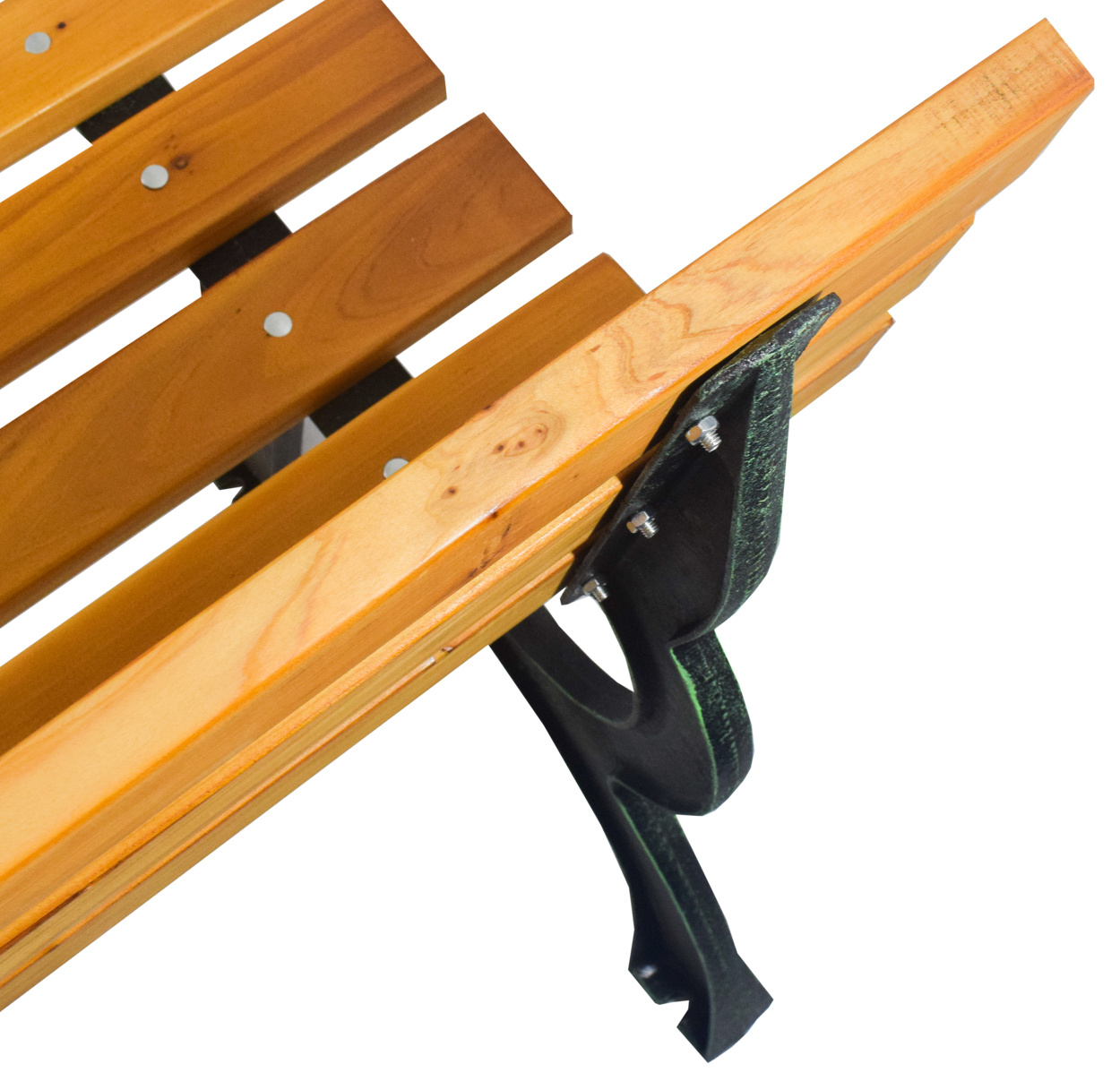 Здрава чугунена конструкция, допълнена с дървени летви. Носеща способност на пейката 240 кг.