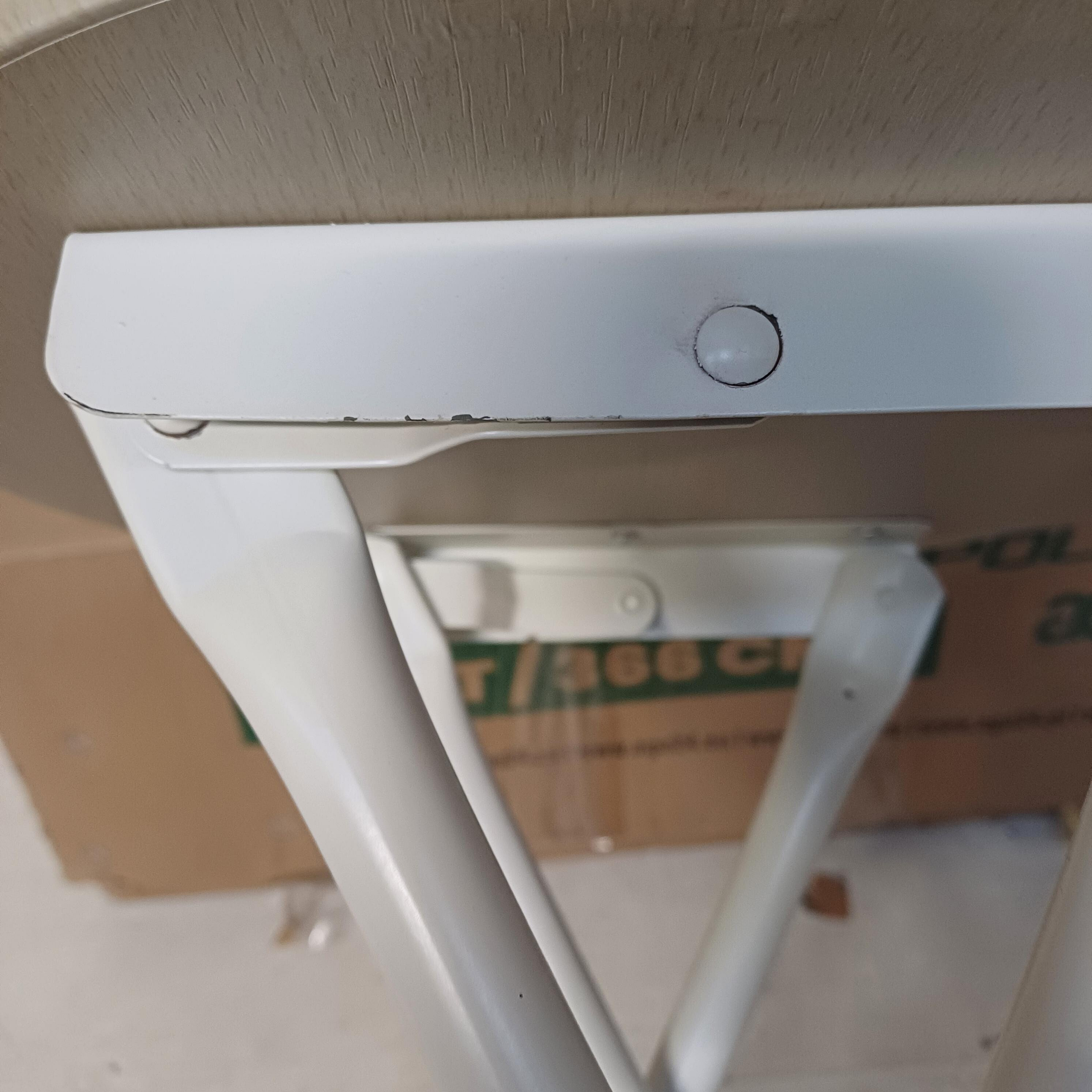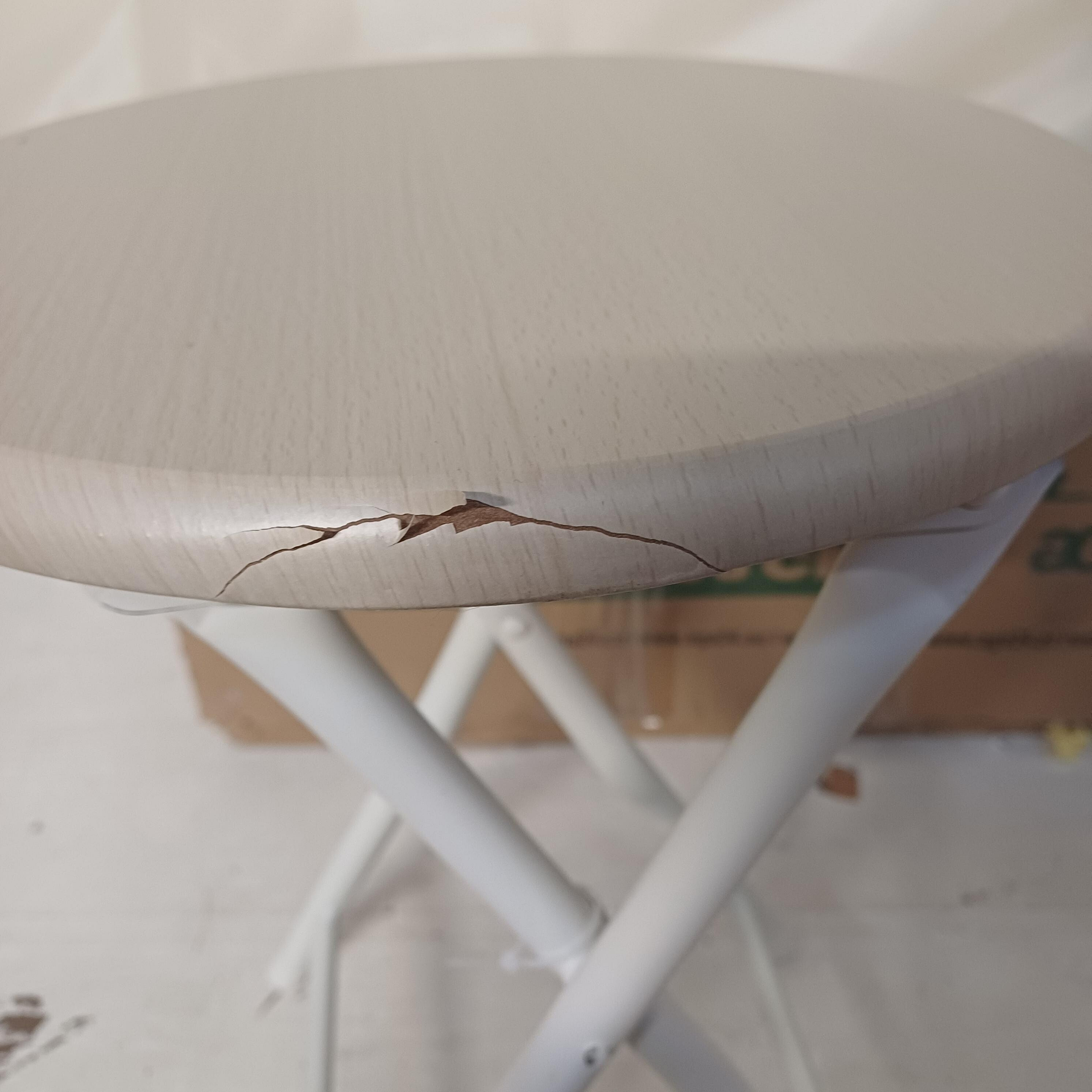 Продуктът показва козметични дефекти под формата на драскотини и частично лющещ се фурнир. Тези недостатъци не влияят на функционалността на стола.