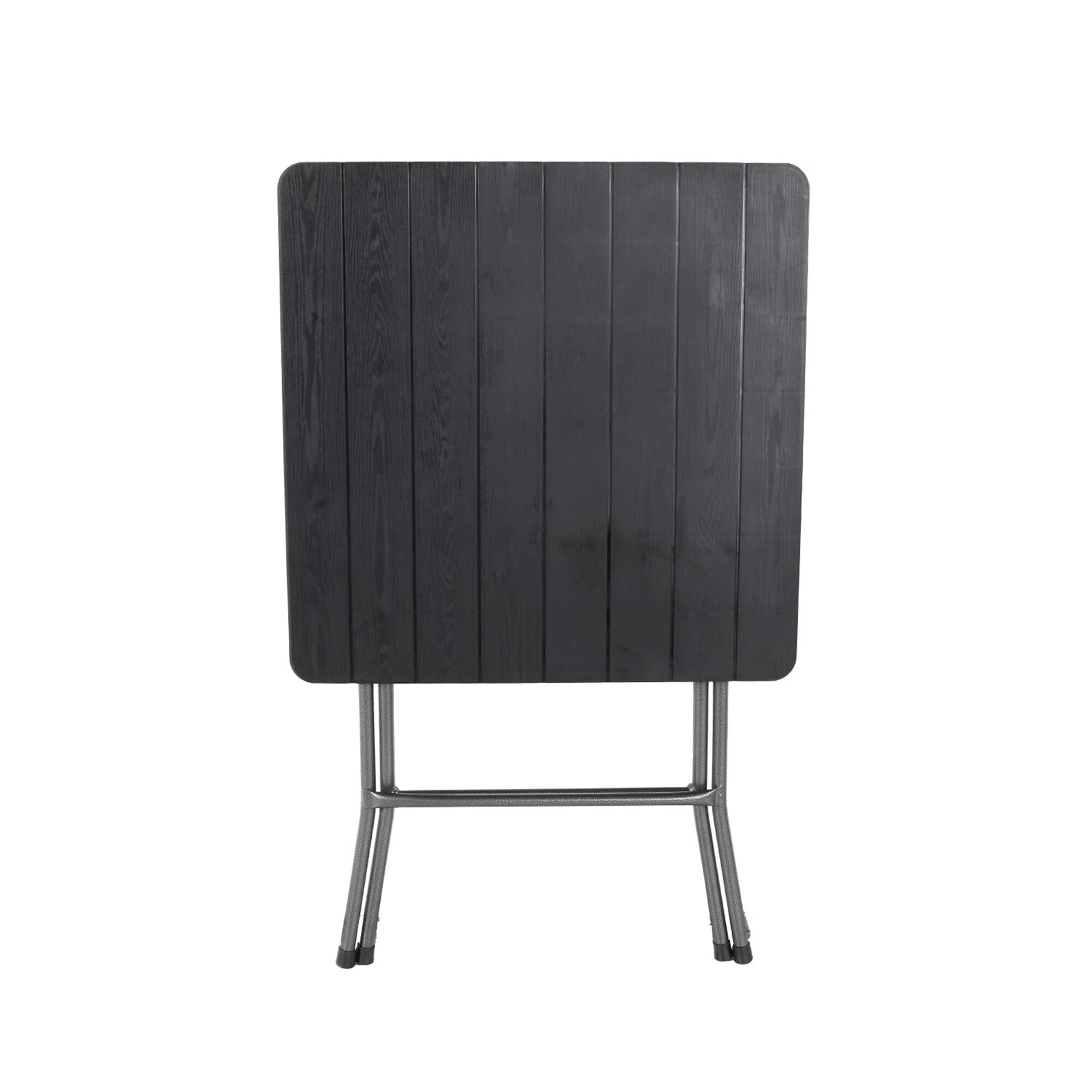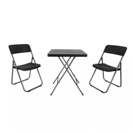 Комплектът включва 2 кресла и маса в черен цвят.Градинската маса има метална рамка и сгъваем механизъм на конструкцията, благодарение на което можете много бързо да разгънете или сгънете масата.