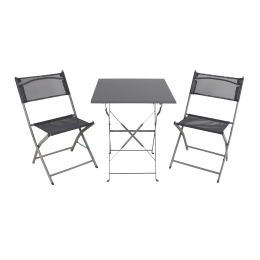 Комплектът включва 2 кресла и маса в сив цвят.Градинската маса има метална рамка и сгъваем механизъм на конструкцията, благодарение на което можете много бързо да разгънете или сгънете масата.