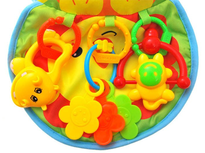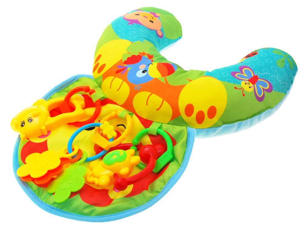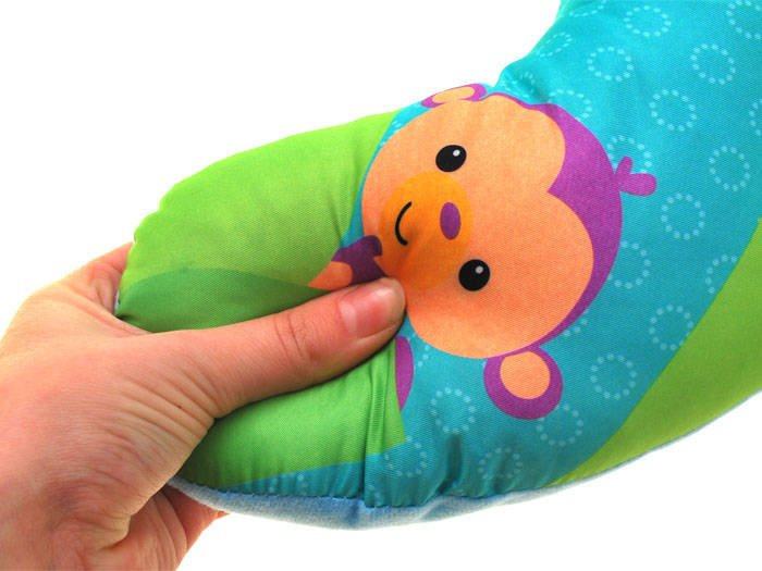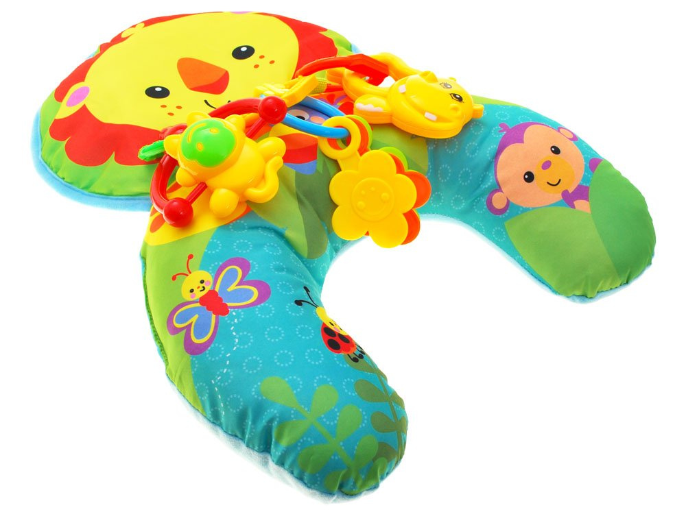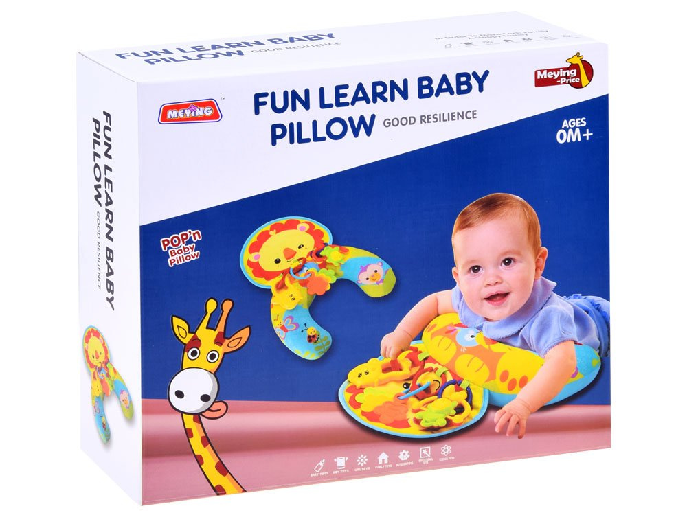 Стабилната възглавница се оказва полезна при грижите за дете. Тази възглавничка със сензационна графика, шумяща подложка и цветни дрънкалки ще осигури много забавление на всяко дете.