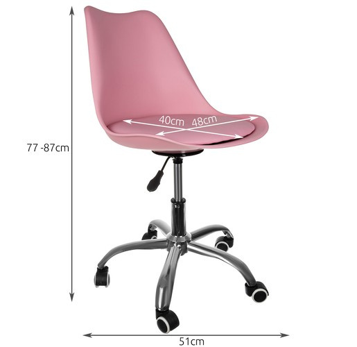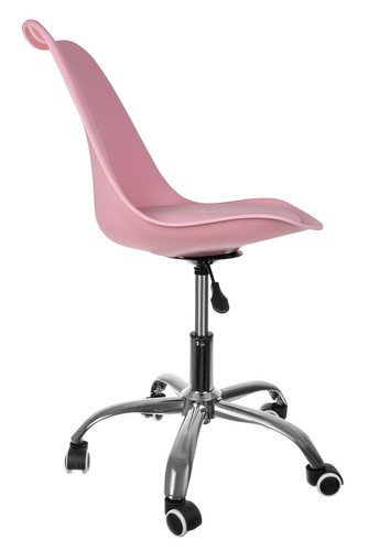 СПЕЦИФИКАЦИЯ - цвят: розов + хром; материал: полипропилен + възглавница от еко кожа; колела: гумени;механизъм: лост; максимално натоварване 150 кг; размери на възглавницата (дължина / ширина): 44 x 38 см; размери на седалката (дължина / ширина): 48 x 40 см; размери на облегалката (ширина / дължина): горна 30 - долна 47 x 40 см; регулиране на височината на стола: 77-87см;тегло на стола: 5,15 кг; тегло с опаковка: 7,16 кг.