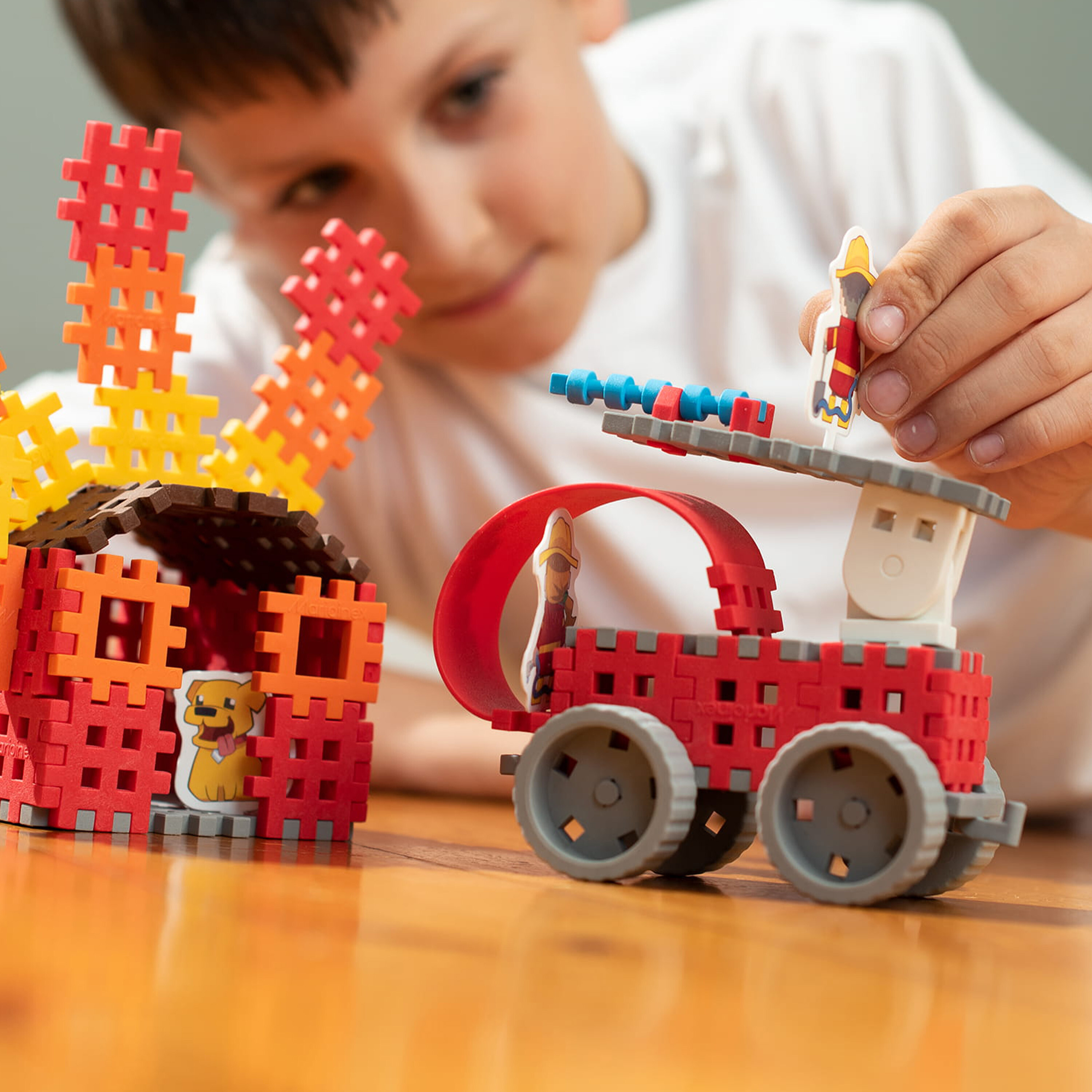 Докато играе, вашето дете ще построи горяща сграда и пожарна кола.