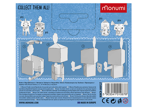 MONUMI е полска марка, създадена от екип от хора, за които работата е страст, а детската радост е основната награда за креативното създаване на играчки, които забавляват и учат. Внимателният подбор на група експерти, които разработват материалите както от съдържателна, така и от художествена гледна точка, е насочен към това нашите продукти ефективно да влияят върху умственото развитие на децата. MONUMI създава уникални хартиени креативни комплекти и книжки за оцветяване за различни групи читатели, като взема предвид техните естетически и интелектуални нужди.