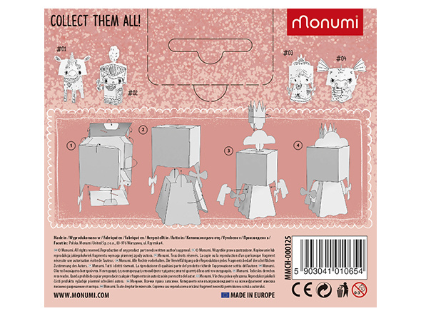 MONUMI е полска марка, създадена от екип от хора, за които работата е страст, а детското щастие е основната награда за креативното създаване на играчки, които забавляват и учат. Внимателният подбор на група експерти, които разработват материалите както от съдържателна, така и от художествена гледна точка, е насочен към това нашите продукти ефективно да влияят върху умственото развитие на децата. MONUMI създава уникални хартиени креативни комплекти и книжки за оцветяване за различни групи читатели, като взема предвид техните естетически и интелектуални нужди.