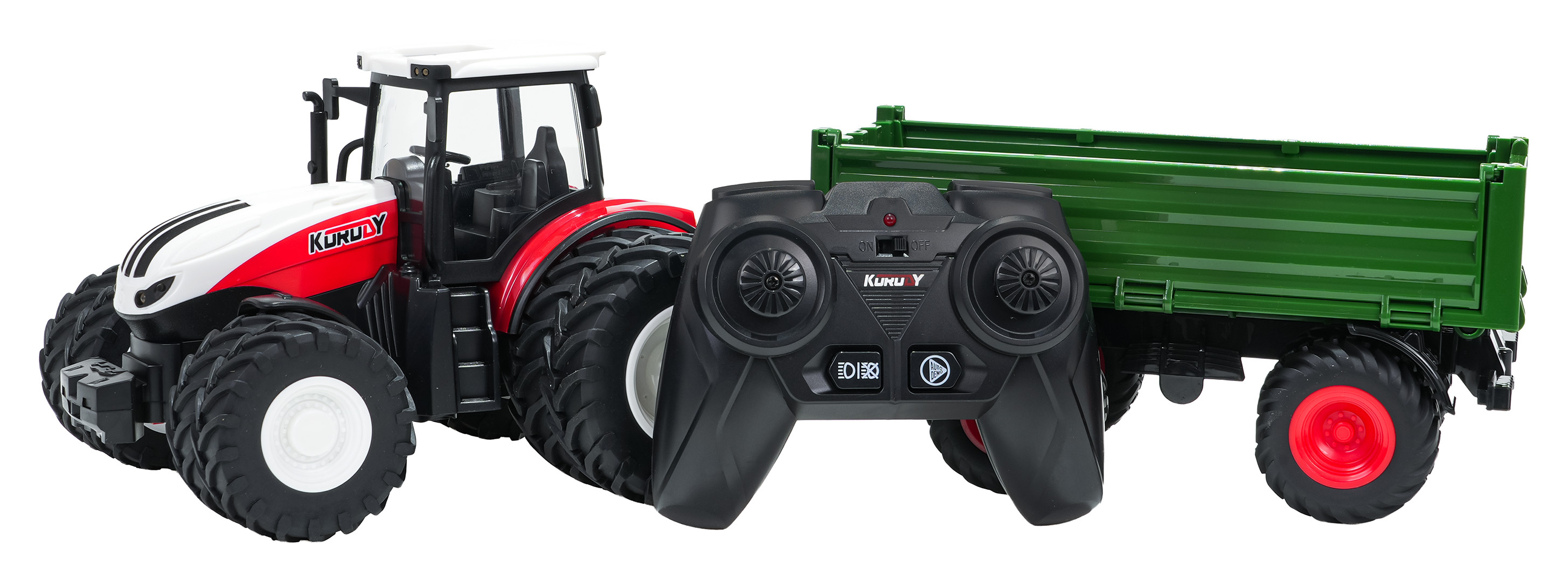 | Дистанционно управляван трактор с ремарке в мащаб 1:24, за деца над тригодишна възраст. Тракторът се движи във всички посоки, напред, назад, надясно и наляво, на големи гумени колела, които му осигуряват добро сцепление с повърхността. Полуремаркето може да бъде откачено от трактора или ръчно повдигнато нагоре, за да се изпразни товарът. Полуремаркето също има сваляеми странични бордове. От пилота можем да изключим осветлението на превозното средство или да активираме демо режим, в който превозното средство демонстрира всичките си възможности. След дълъг период на бездействие тракторът се изключва, за да пести батерията. Играчката се захранва с батерия тип 3,7V, а дистанционното управление с батерии тип 2 x AAA 1,5V (не са включени в комплекта). Функции на тракторчето: - за деца от тригодишна възраст, - мащаб на изпълнение 1:24, - дистанционно управление 2,4 GHz, - се движи във всички посоки, - големи, гумени, двойни колела, - сменяемо ремарке, - ръчно повдигане и спускане на ремаркето, - сваляеми бордове на ремаркето, - осветление на върха, кабината и предната част на превозното средство, - възможност за изключване на осветлението, - DEMO режим от дистанционното управление. |