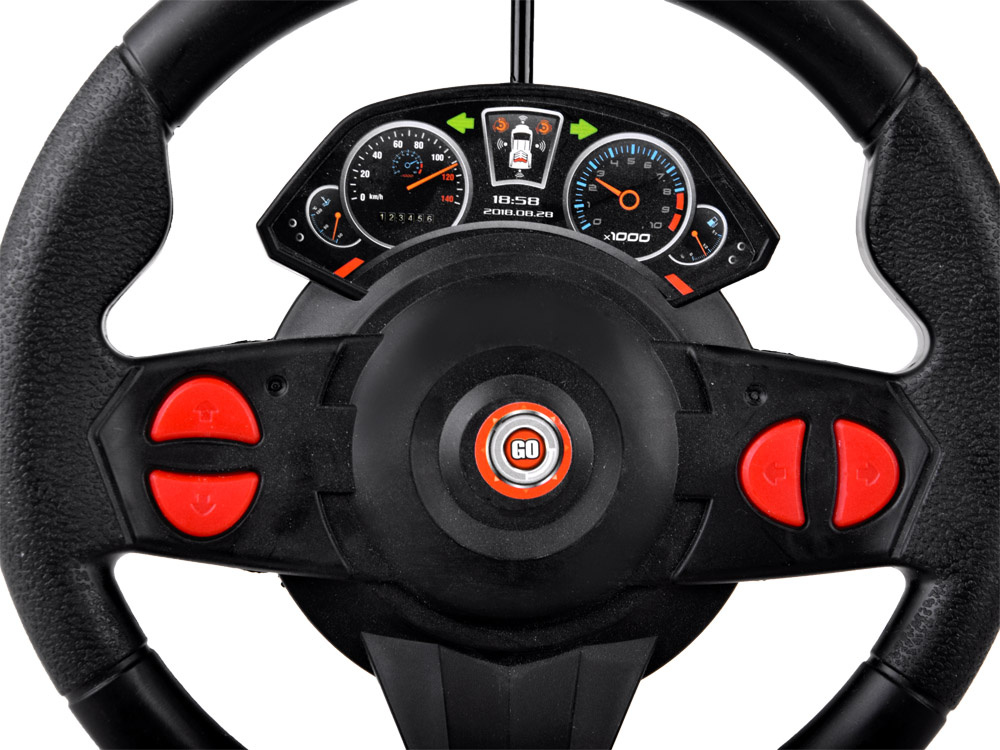 Спортният автомобил с дистанционно управление, волан и педали ще ви осигури часове на невероятно забавление. Автомобилът с футуристичен и елегантен силует със сигурност ще зарадва всеки почитател на четирите колела. Като истински спортен автомобил, той има ниско окачване, спойлер и осветление (отпред). Шофьорът има пълен контрол над автомобила с помощта на дистанционното управление във формата на волана. Дистанционното управление на волана е много интуитивно и се държи удобно в ръката. Автомобилът може да се управлява и чрез педалите, прикрепени към волана, които се използват за движение напред и назад. Целият комплект е допълнен от семафори, които правят забавлението още по-интересно.