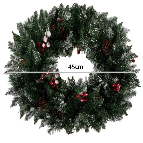 СПЕЦИФИКАЦИЯ - материал: игли: PVC, рамка: желязо с изкуствено кранче и шишарки; диаметър: 45 см; дължина на клончето: 12-14 см; пластичност (възможност за огъване): да; вътрешно/външно: да; тегло: 0,7 кг; тегло на опаковката: 0,858 кг.