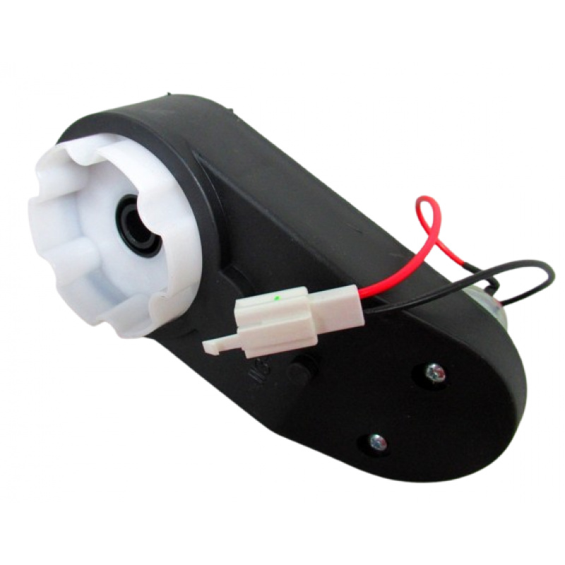 Заден мотор с предавателна кутия за акумулаторно превозно средство. Технически параметри: Напрежение - 12V Брой обороти - 16 000 об/мин Модел на мотора RS 380 Диаметър на отвора за оста - 10 мм Диаметър на задвижващото колело (белия елемент) - 58 мм Диаметър на мотора - 27 мм Брой издатини на задвижващото колело (белия елемент) 6