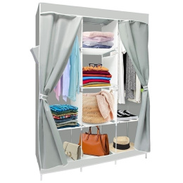 Голям, троен сгъваем гардероб. Полезна в гардероба, по време на пътуване и т.н. Лека, здрава конструкция от стоманени тръби. Много място за окачени и сгънати дрехи. Техническа спецификация: - калъф, изработен от дишаща тъкан - закопчаване с цип - 8 рафта (размери. ах. 40x40x38 см) и 2 отделения с закачалки (разм. ах. 118x40x40cm) - общи размери: височина:168cm ширина:126cm дълбочина: 42cm размери на опаковката: 59x27x7,5cm Брой части. на палета: 160