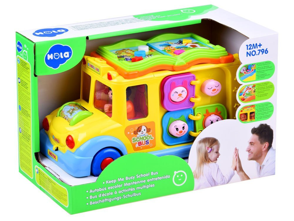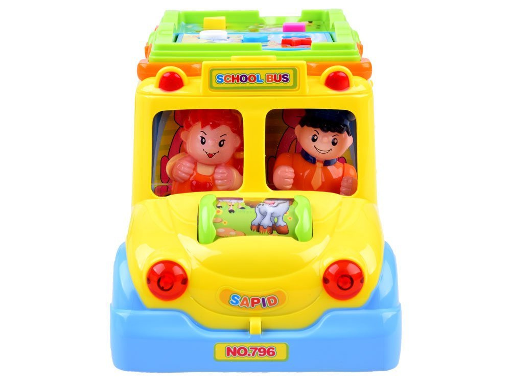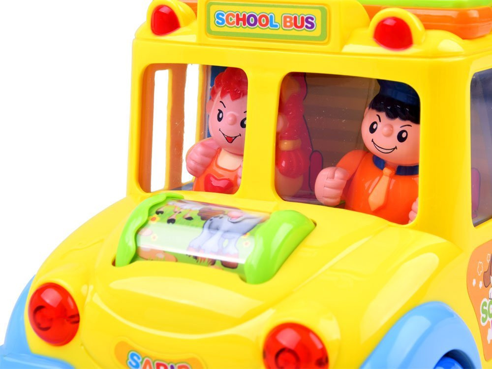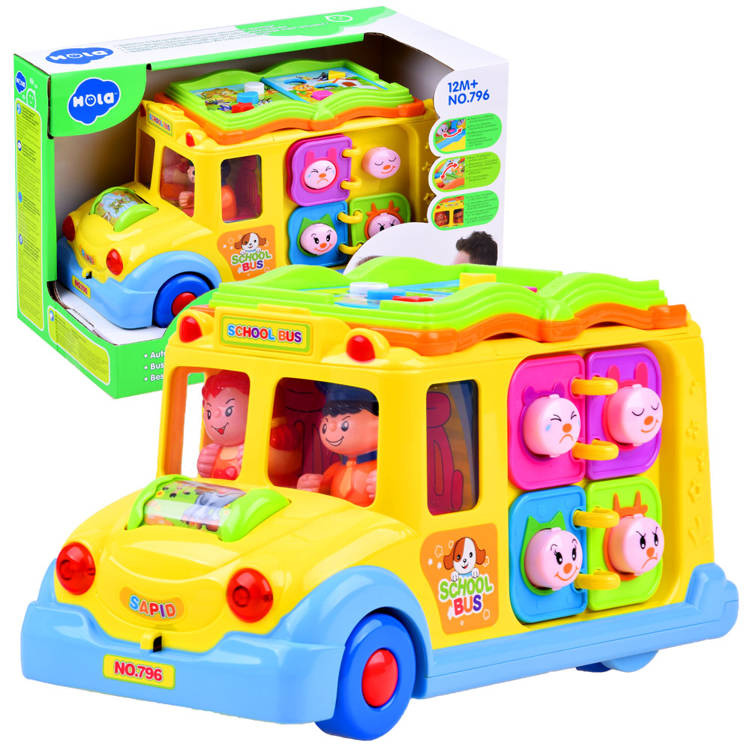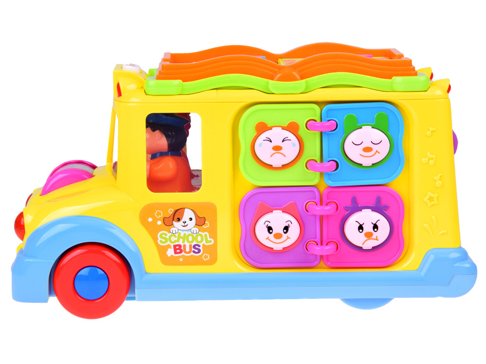 Играчката може да се движи сама и да променя посоката на движение всеки път, когато се сблъска с препятствие, но детето може също така да я управлява самостоятелно. По време на шофиране свири весела музика и предните светлини мигат. В предната част на автобуса се намира цветен въртящ се цилиндър с животни, който при завъртане пуска звуци на смеещо се дете и мелодия. На покрива на играчката има цветна брошура с копчета в различни цветове и форми. Натискането на бутоните ще възпроизведе звуците на животните, които са на изображението. Бутоните също така възпроизвеждат звуци на клаксон, стартиране на двигателя и мелодии. Отстрани на колата има 4 усмивки с различни изражения от весело до тъжно. Емотиконите са заобиколени от цветни рамки, които са подредени като страници на книга. От другата страна на автомобила има 4 зъбни колела с манивела, която може да се върти. На задната страна на играчката има врата със звънец, който издава звук. Зад вратата има цветни картини, които се променят при завъртане на ключа.